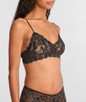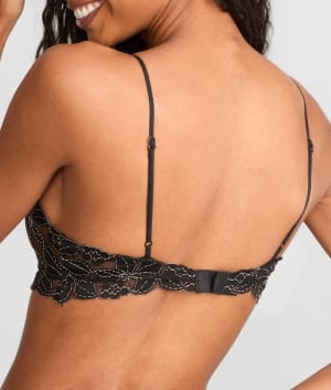 • Wire-free seamed lace cups with a stitched floral pattern & scalloped trim