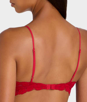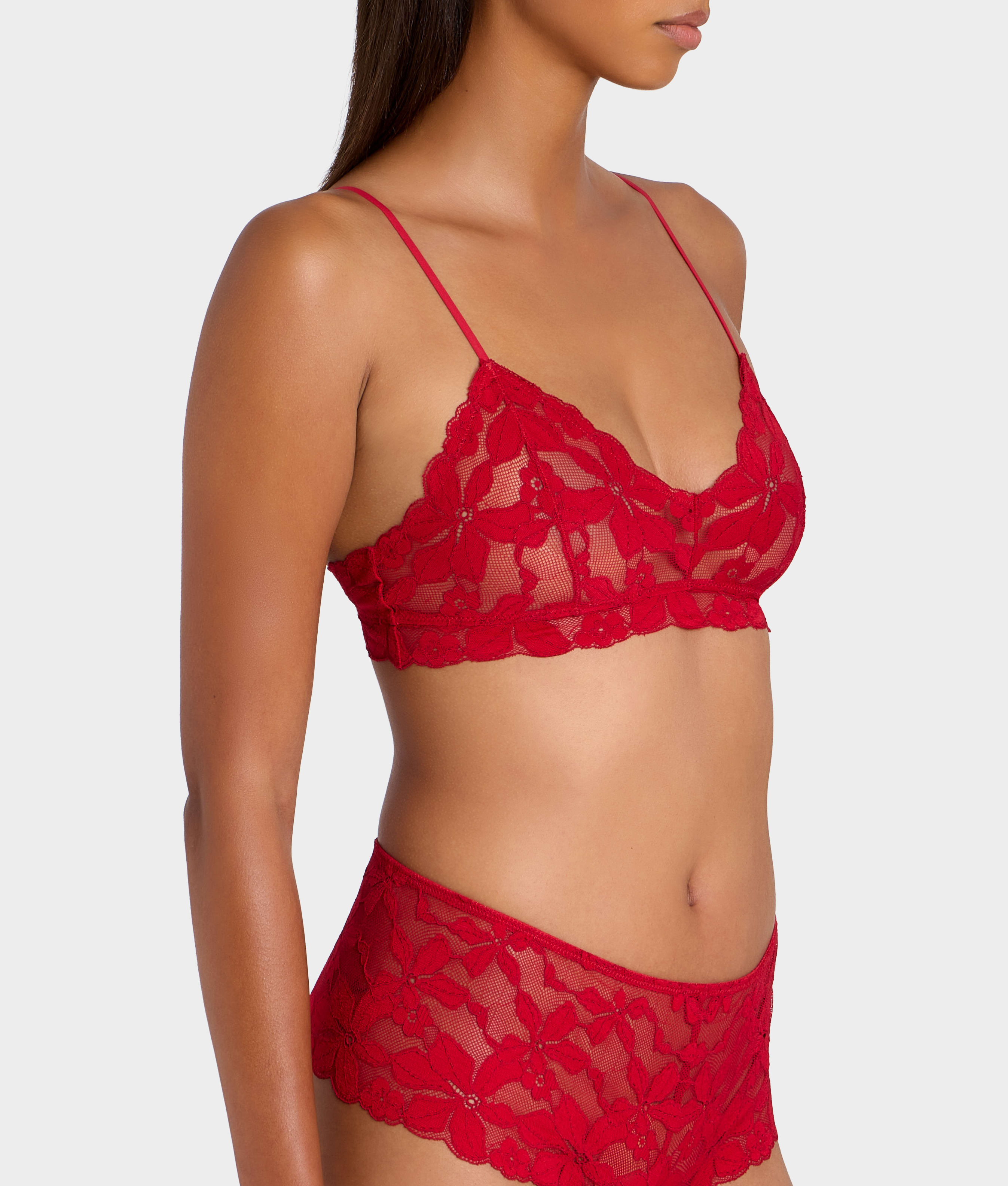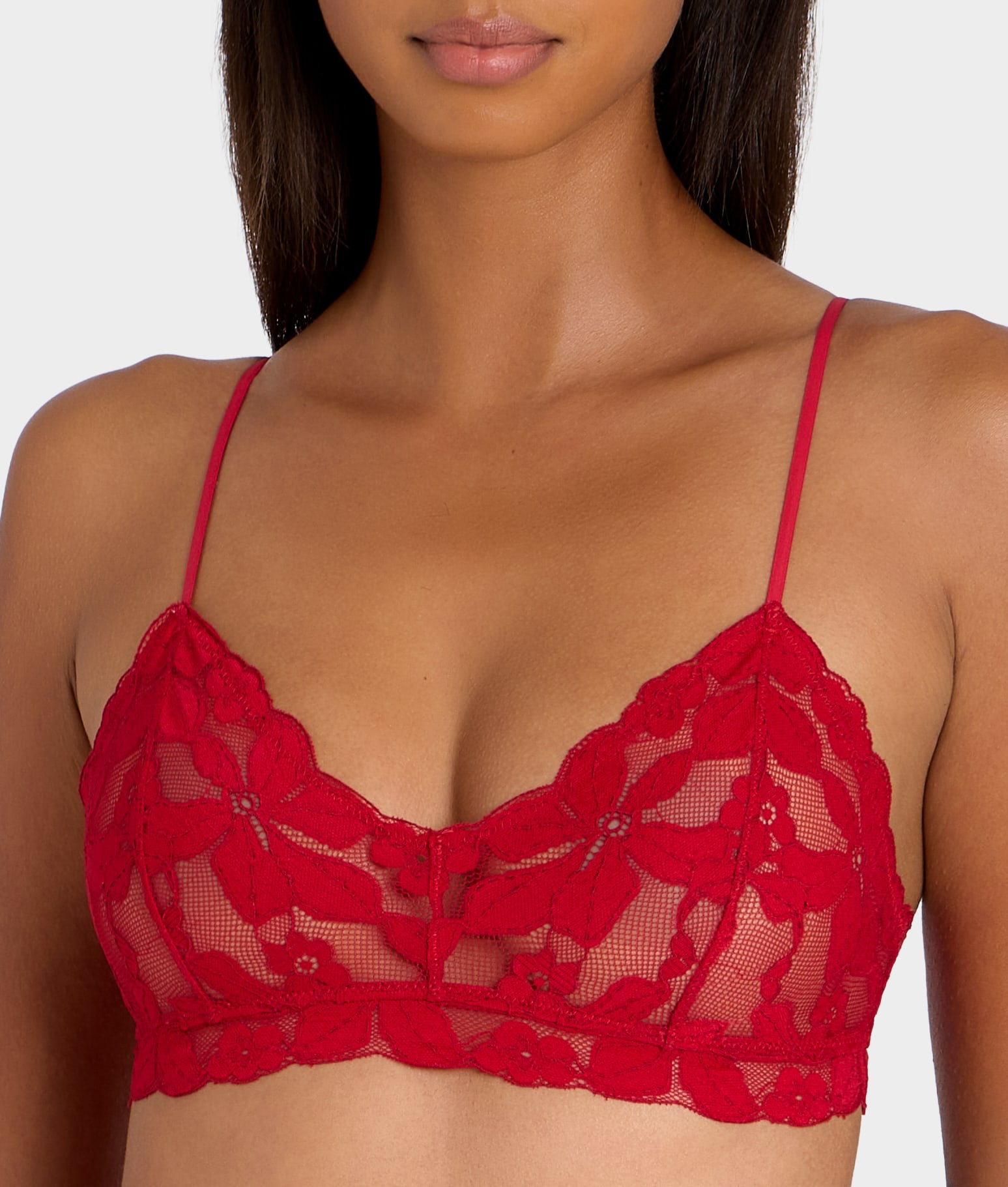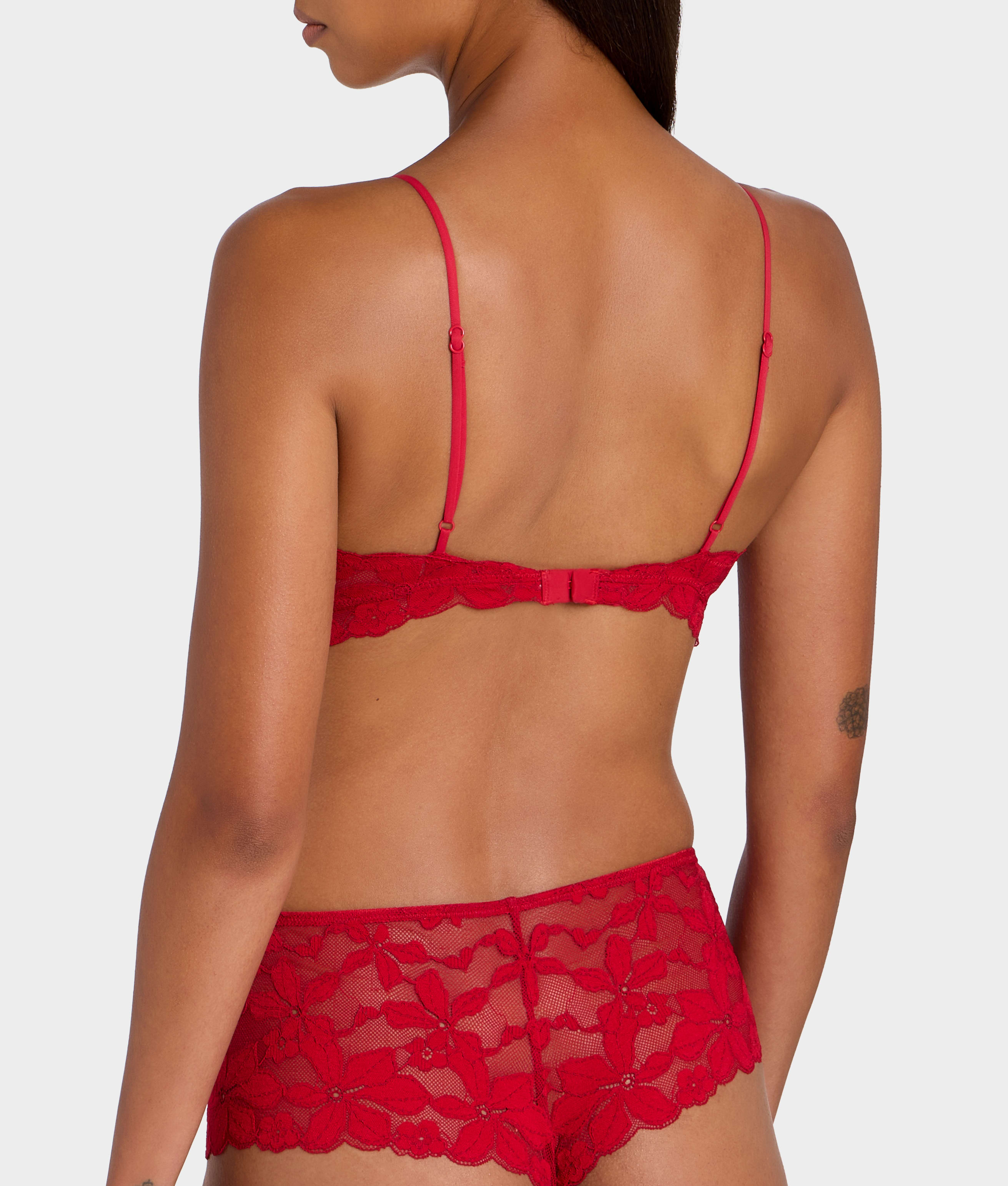- Wire-free seamed lace cups with a stitched floral pattern & scalloped trim
