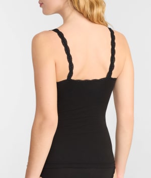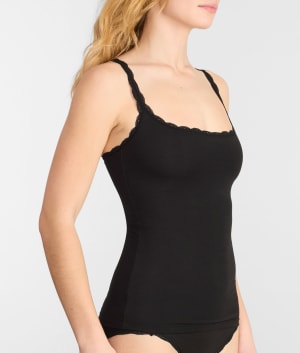 - Scalloped lace trim at neckline and on non-adjustable straps