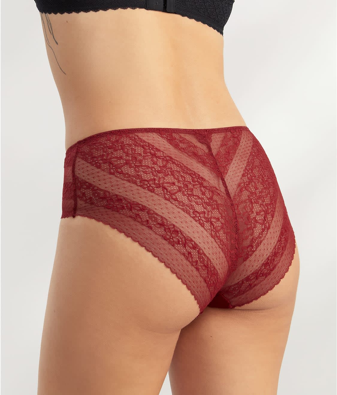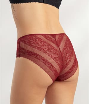 - Modest rise hi-cut brief with delicate lace at hips & rear