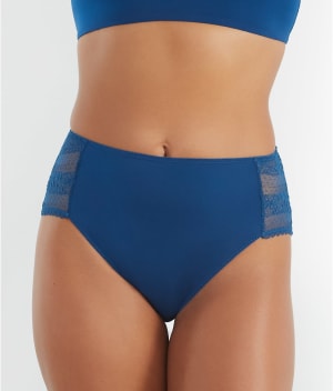 - Modest rise hi-cut brief with delicate lace at hips & rear