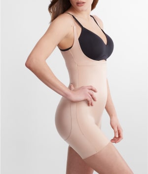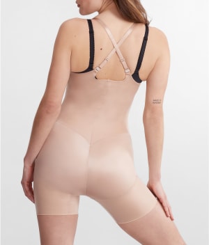 • Slim your silhouette with this mid-thigh shaper bodysuit