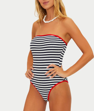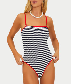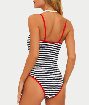- Nautical inspired one-piece with a chic stiped crochet pattern