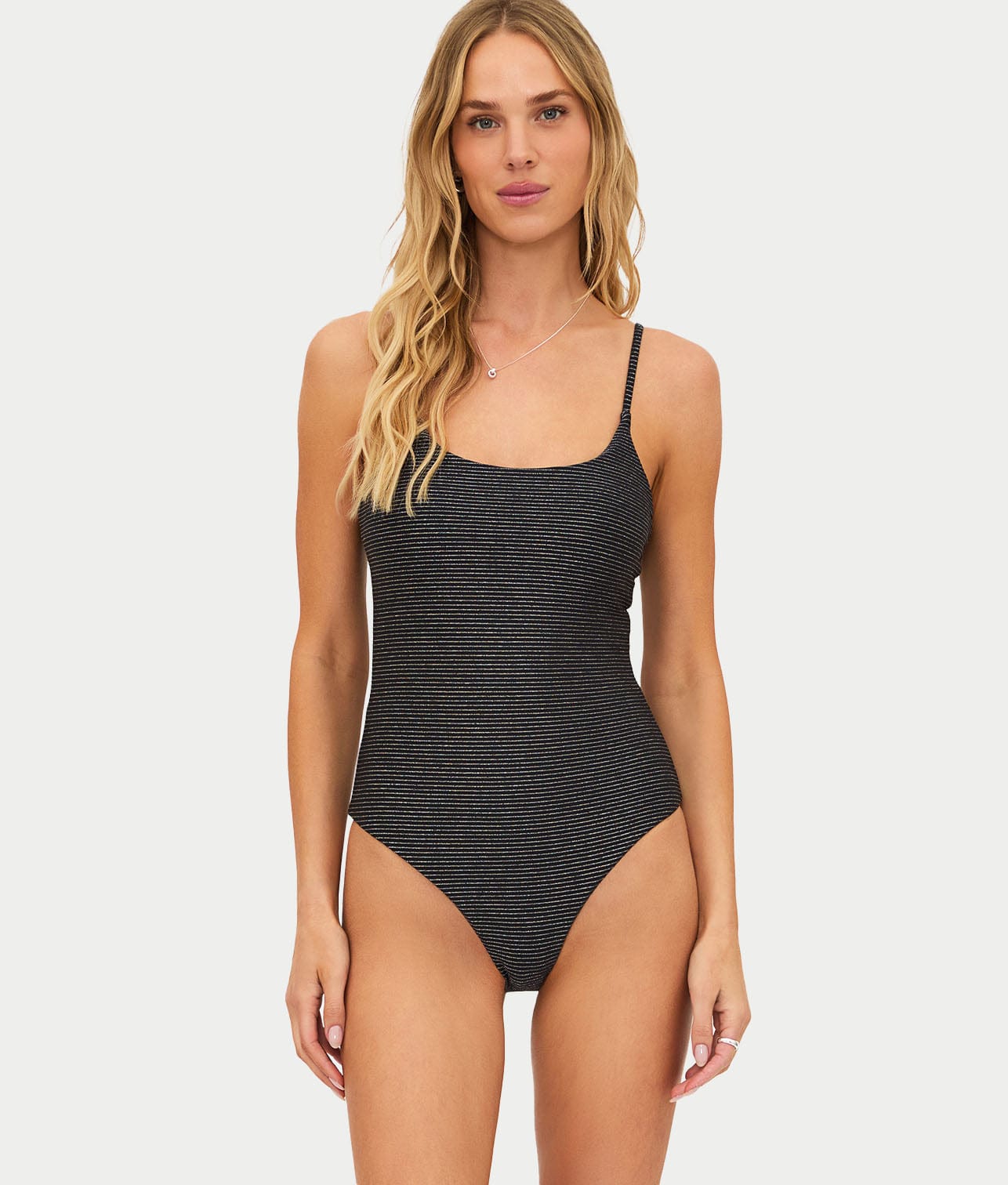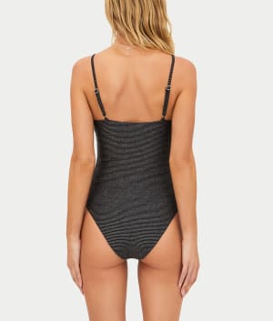 • Soak up the sun in this finely ribbed one-piece with metallic fabric