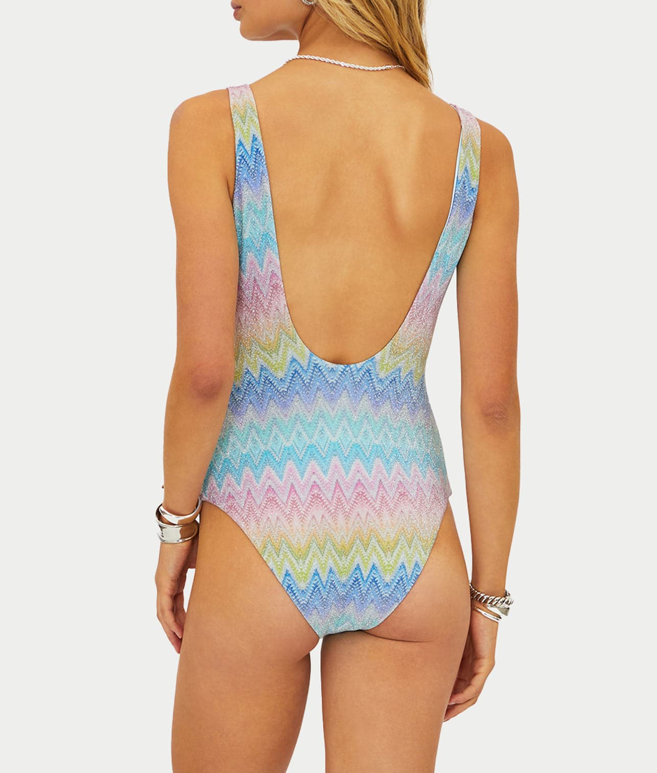 • Feel chic in this multi-colored chevron pattern one-piece