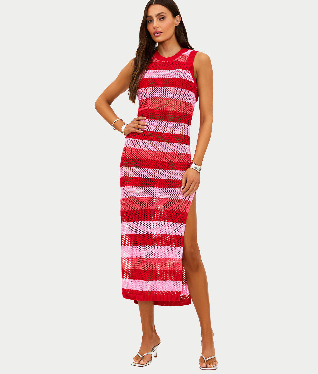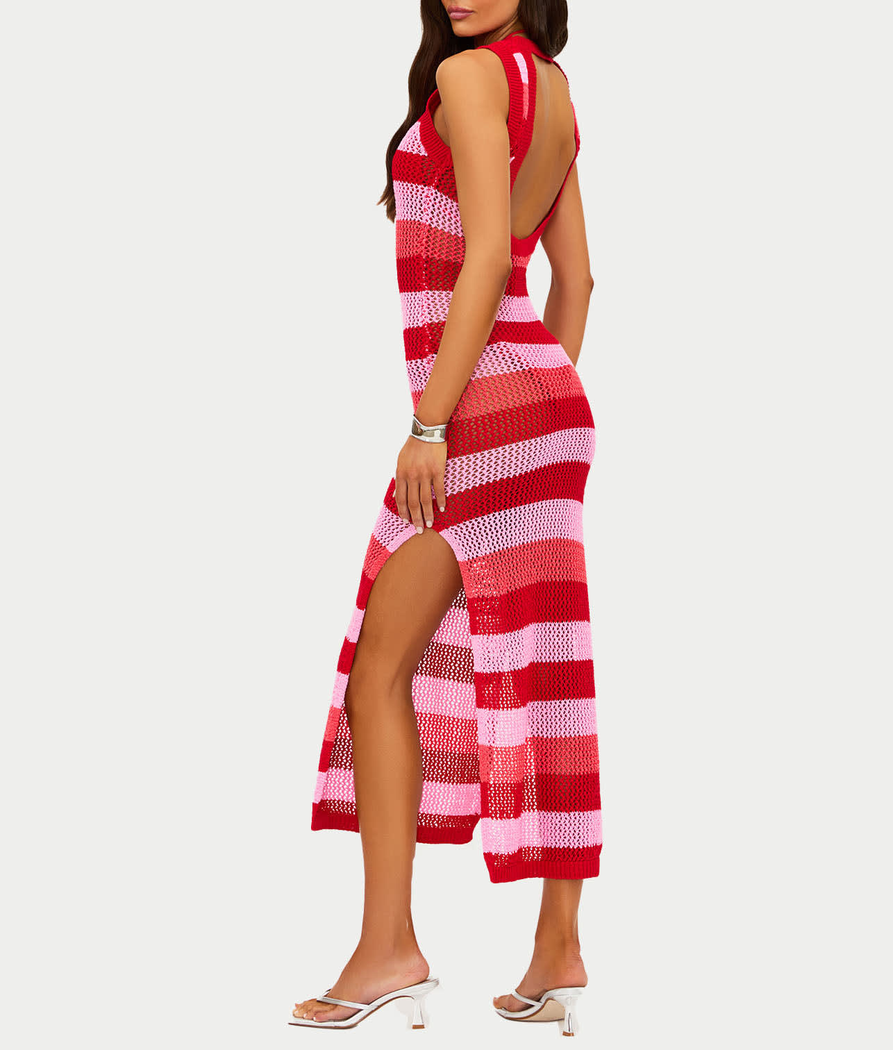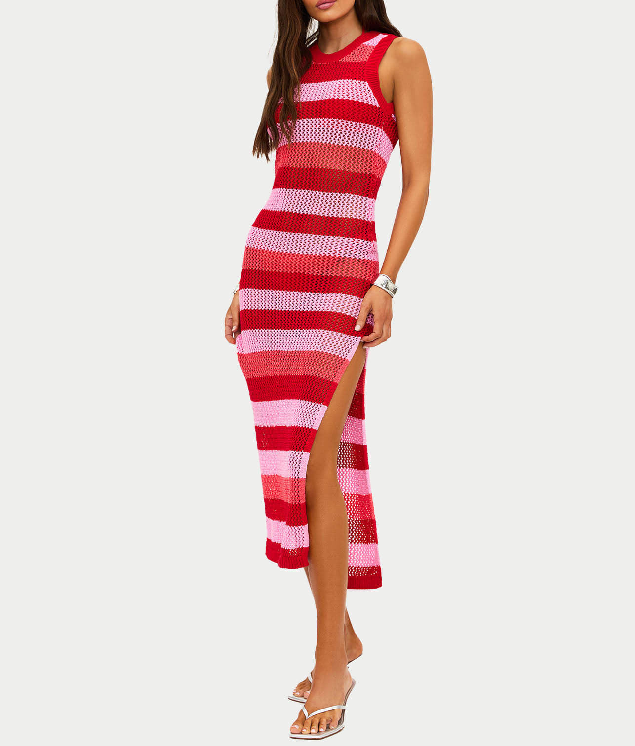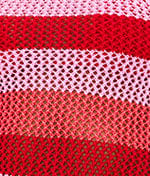 • Striped crochet-knit fabric in ruby, blush, and pink hues