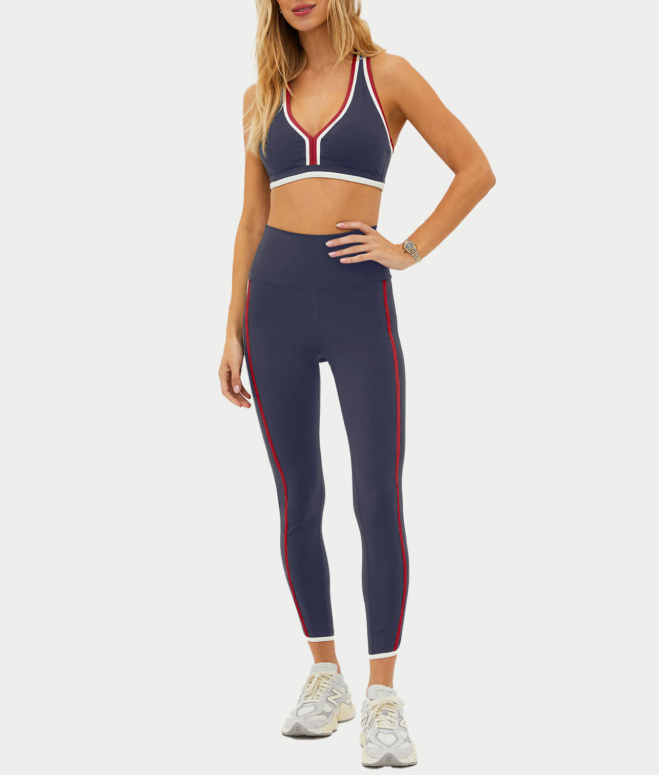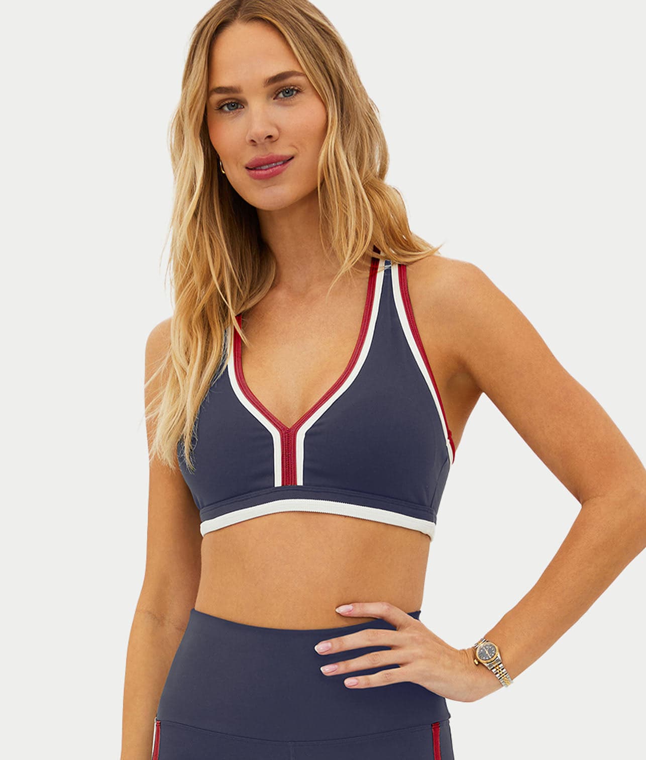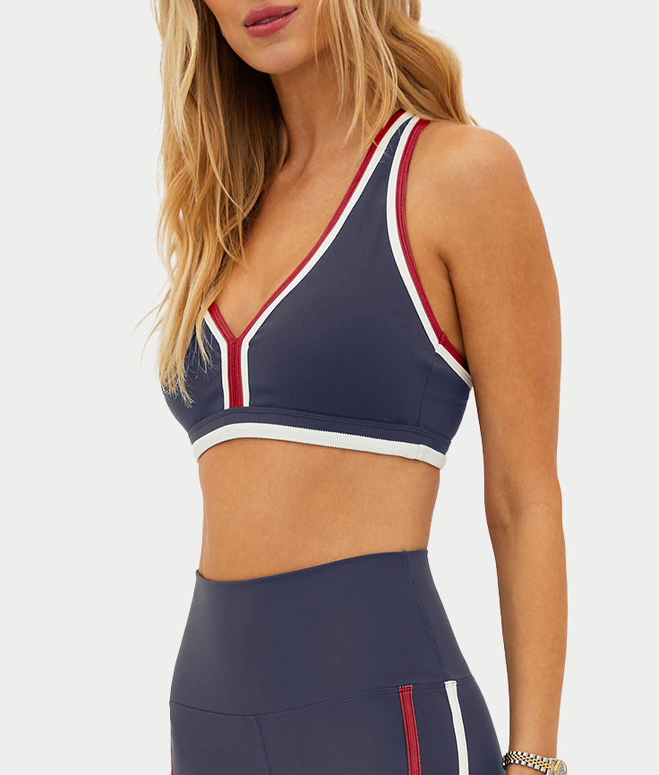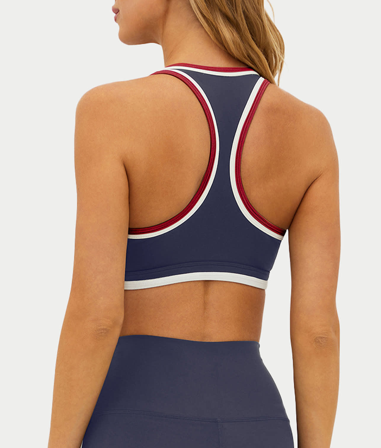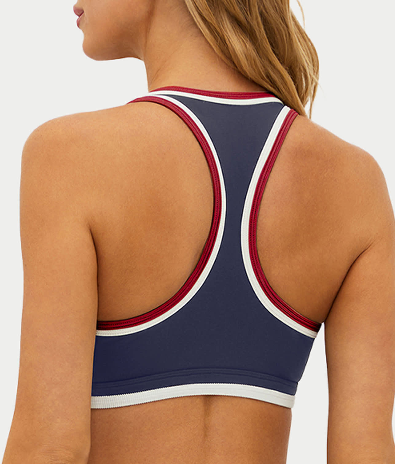 • Feel fashionable and sporty in this red, white and blue sports bra
