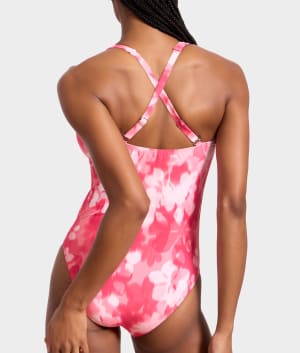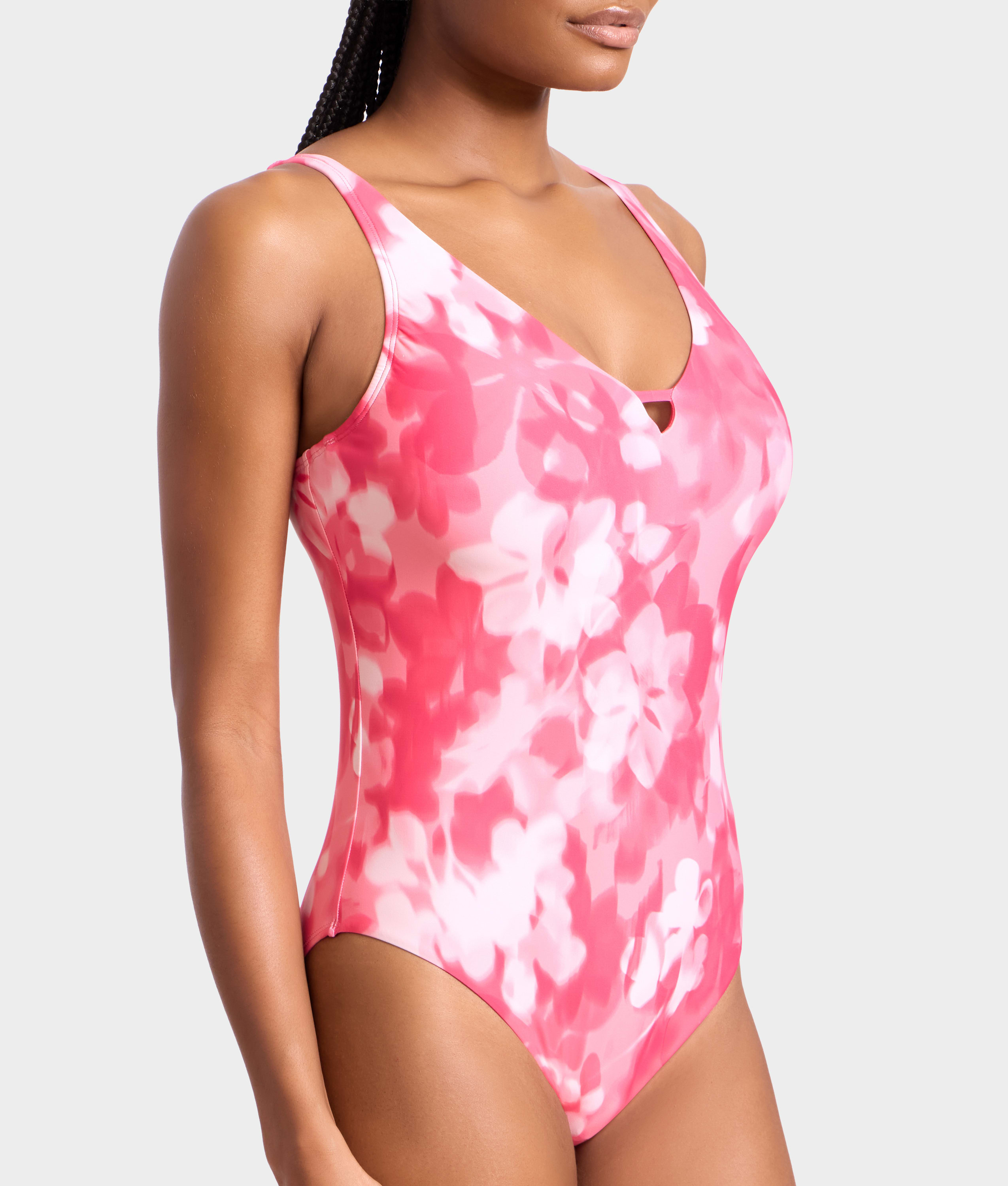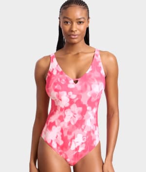 • Feel chic at the shore in the sleek plunging one-piece
