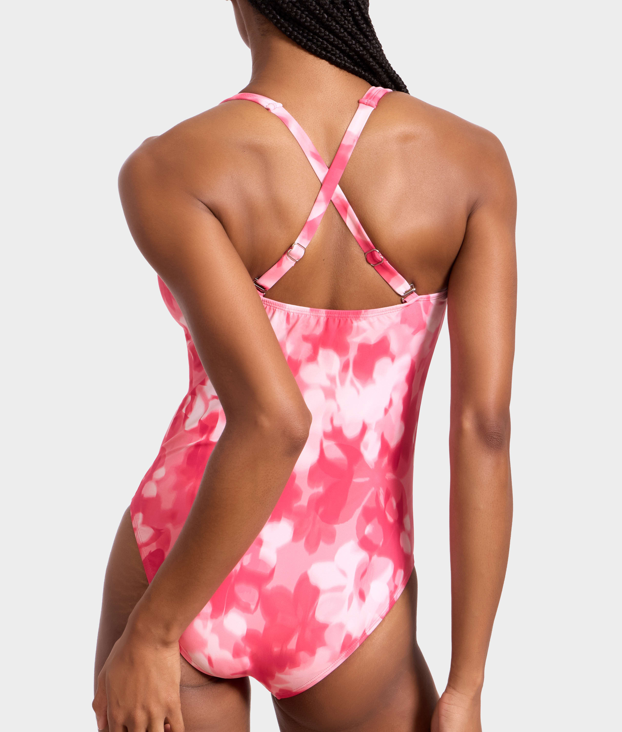 • Back-adjustable stretch straps convert to cross-back