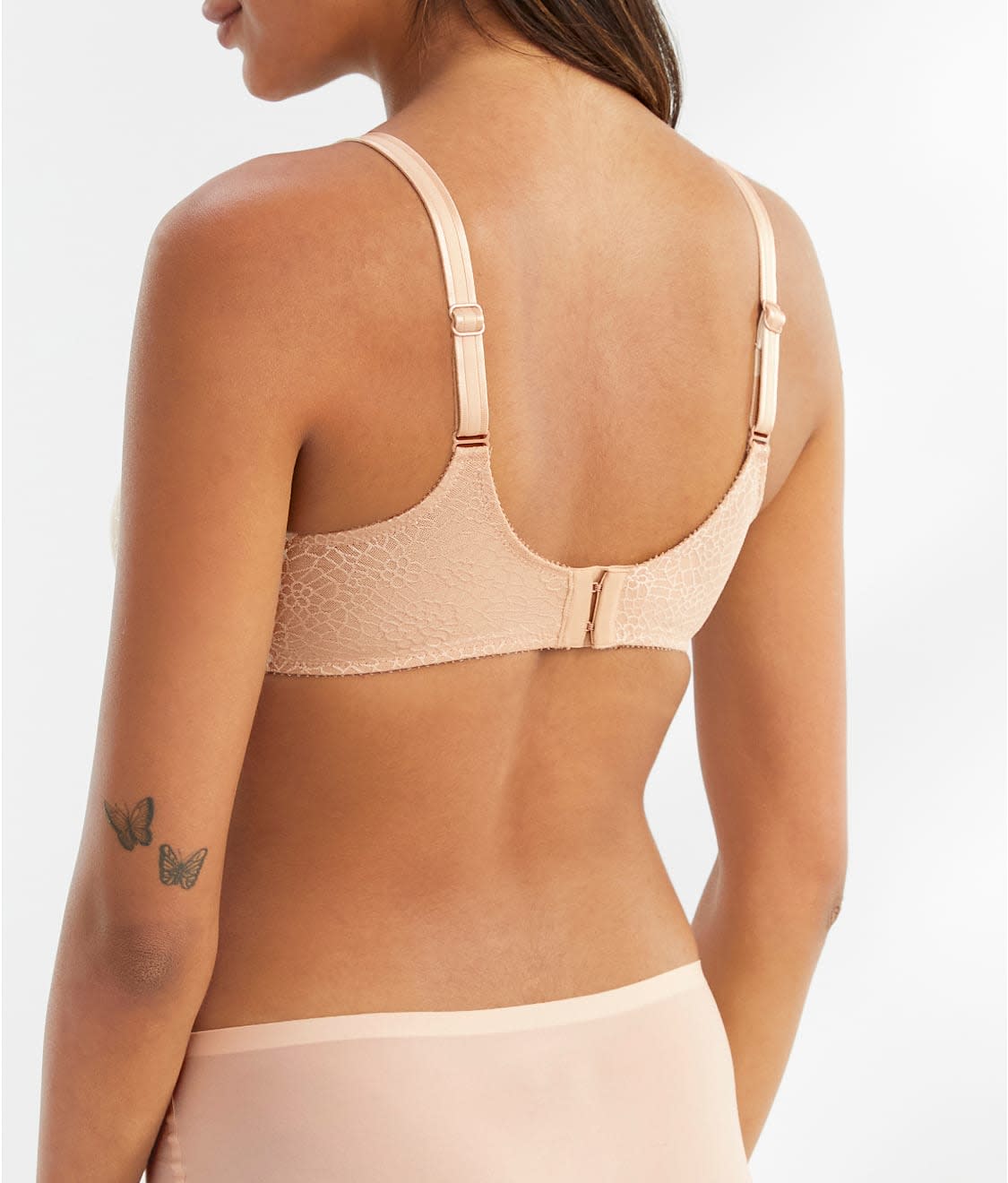 • Lightly lined underwire cups minimize while still creating a rounded, natural shape