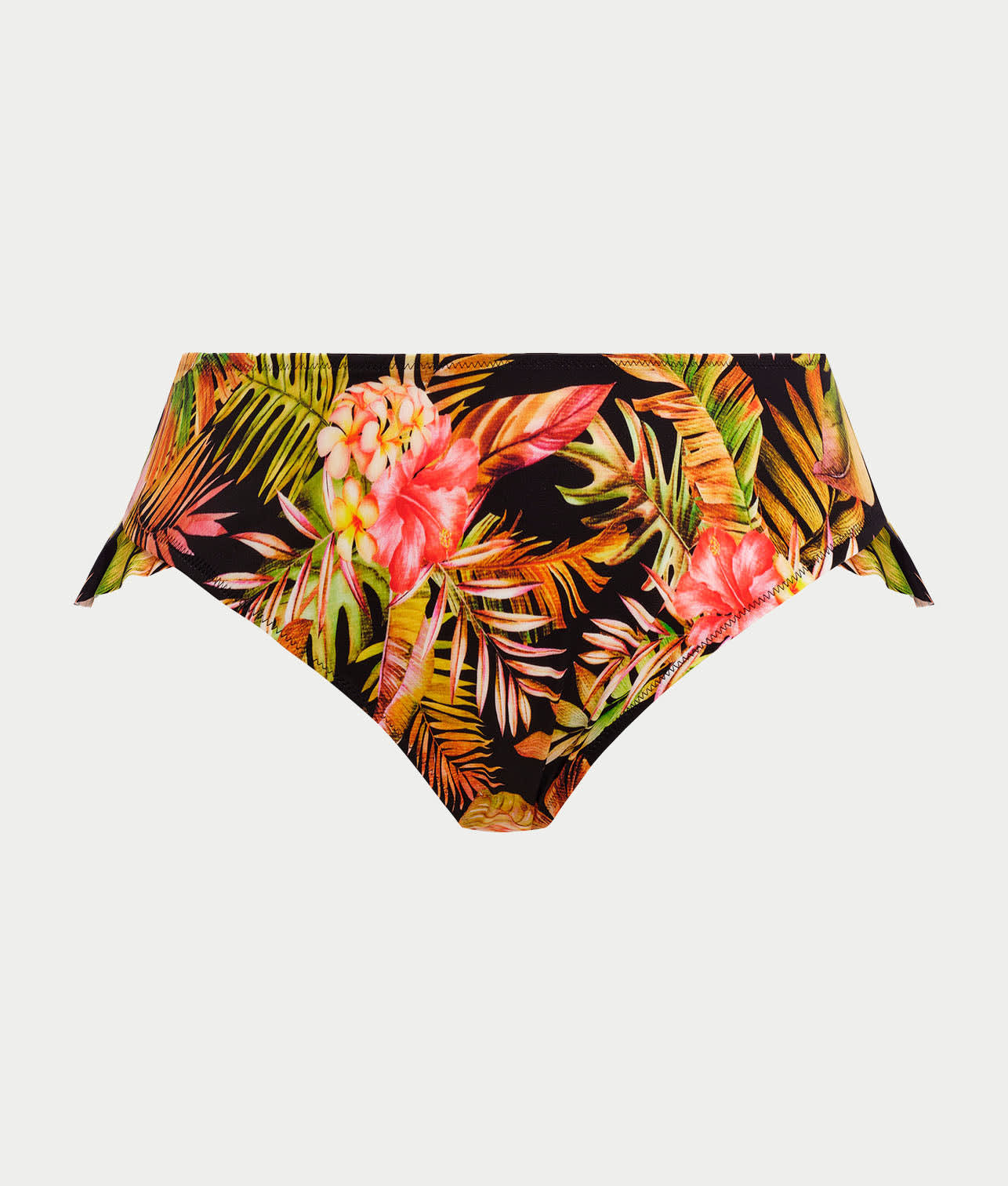 • Bold tropical print bikini bottom with leafy greens and hibiscus pinks