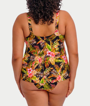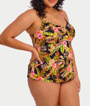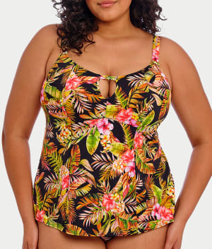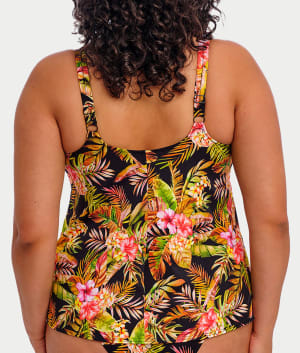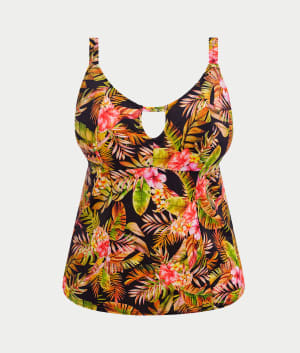 - Feel the island breeze in this black tropical tankini top
