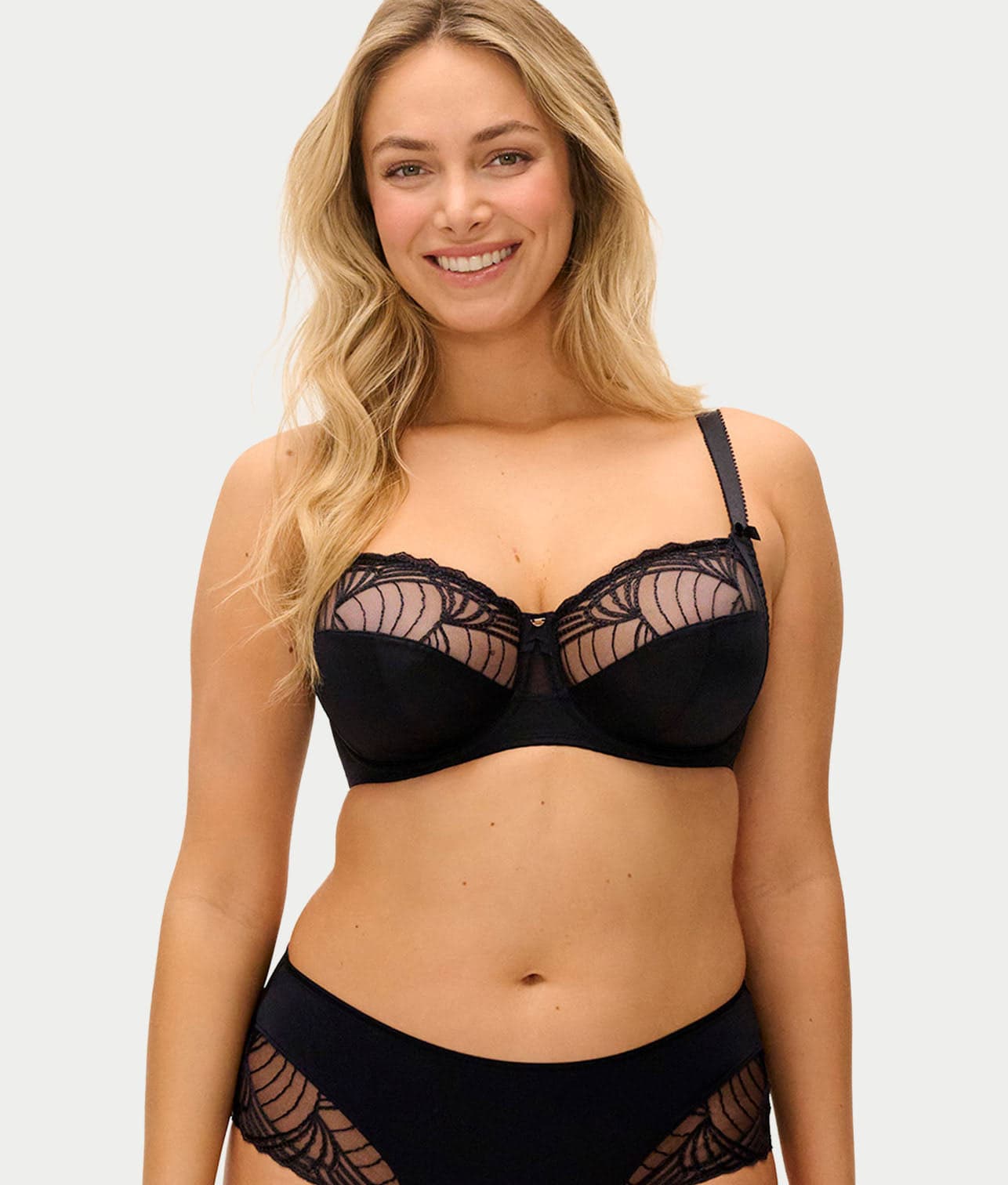 - Patterned mesh and lace with powernet back wings