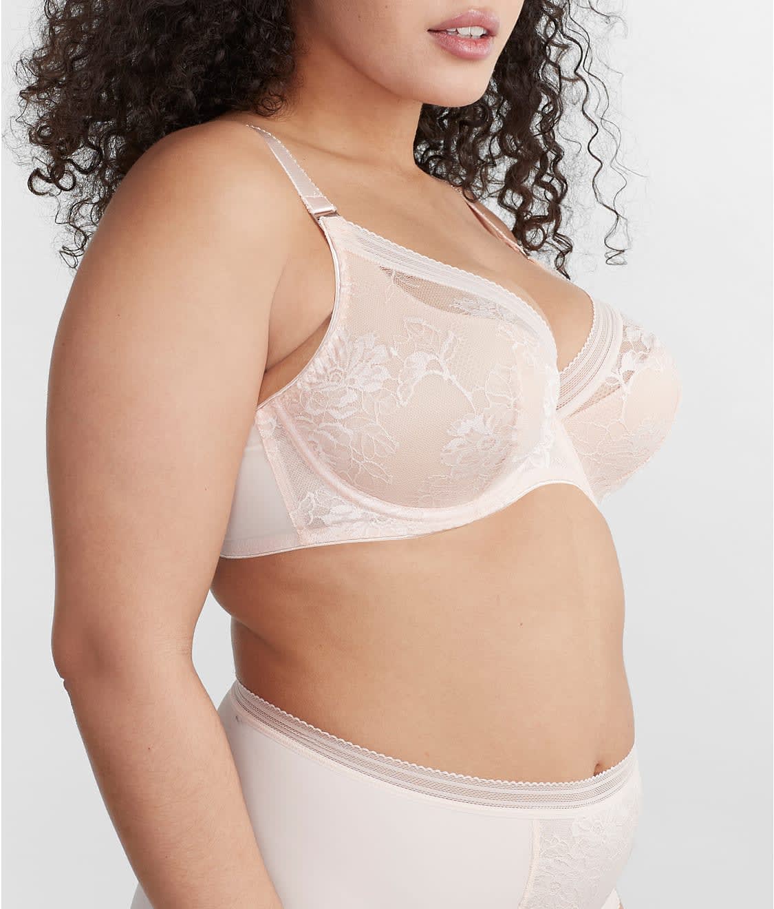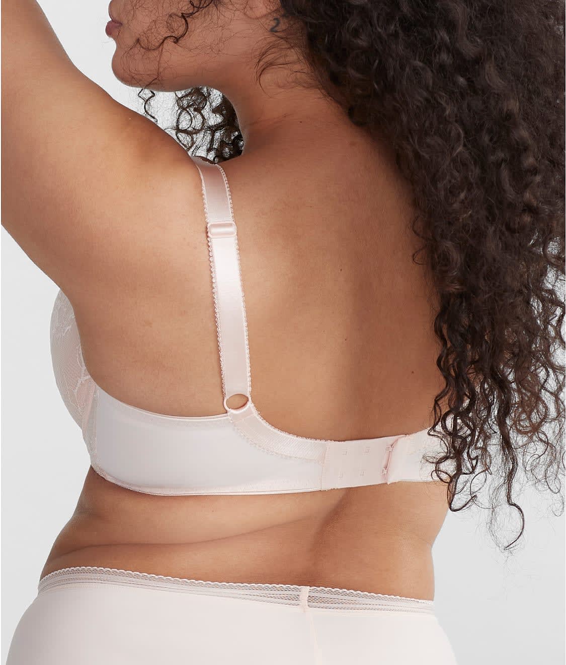 • Flat lace adorns cups with elasticated neckline for a custom fit