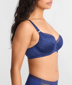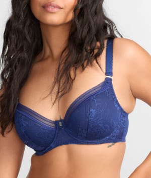 • Flat lace adorns cups with elasticated neckline for a custom fit