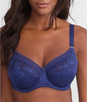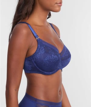 • Flat lace adorns cups with elasticated neckline for a custom fit