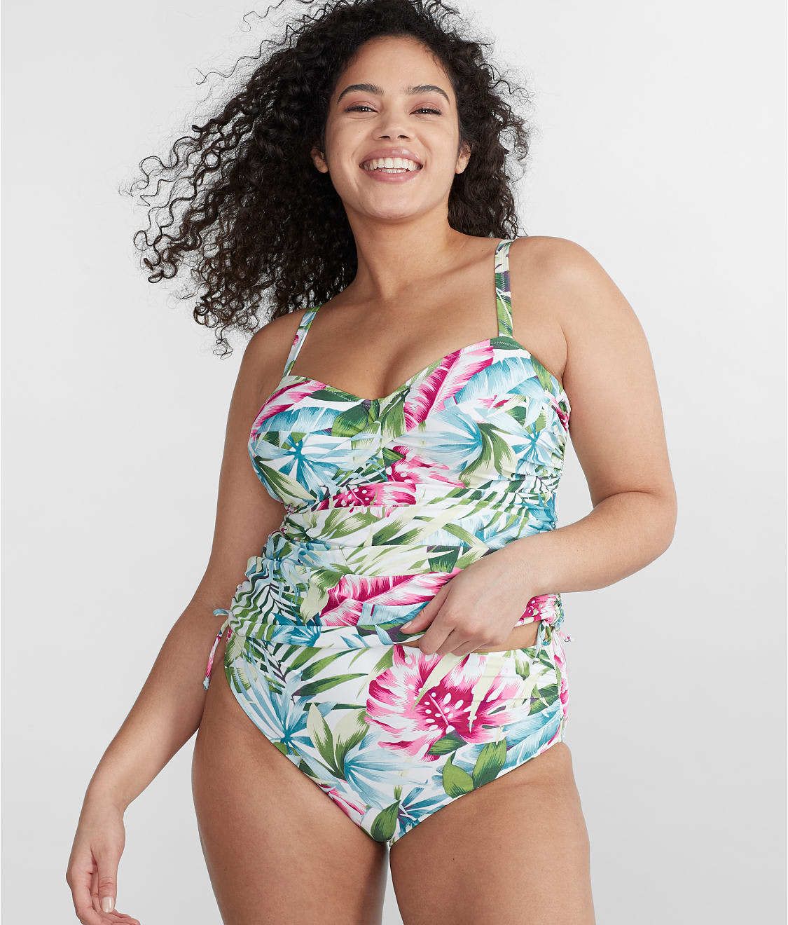 • Ruched sides with adjustable string ties