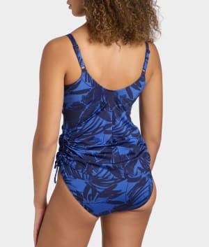 - Twist front tankini top adorned with a navy palm leaf print
