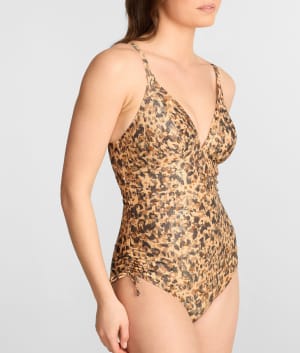 - Hit the beach in this plunging one-piece with a shimmery animal print