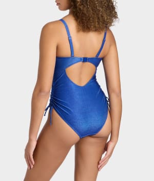 • Hit the beach in this plunging one-piece with a shimmery animal print