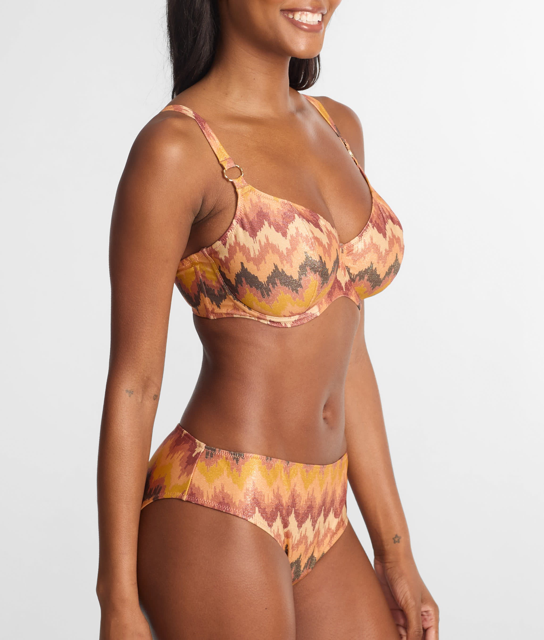 Body: 61% Polyester,15% Polyamide, 13% Elastane, 11% Metallic: Cup Lining: 72% Polyamide, 28% Elastane. Wing Lining: 86% Polyamide, 14% Elastane.