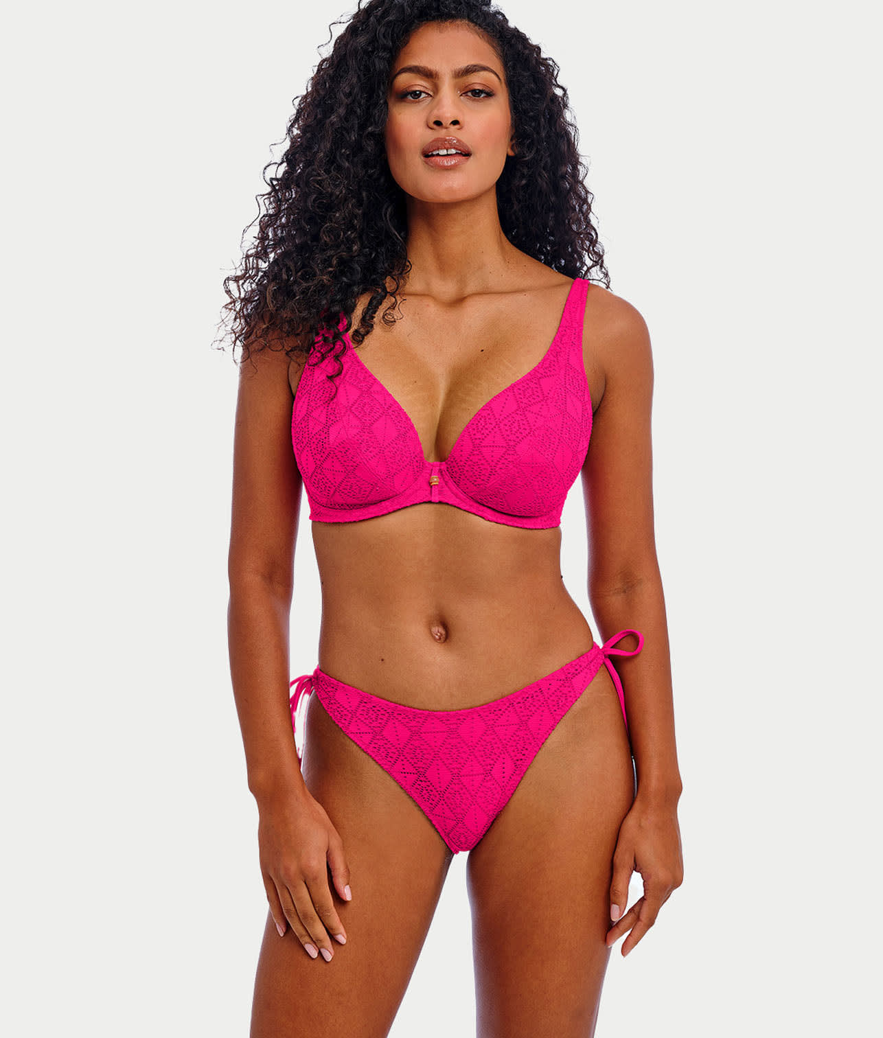 • Low plunging neckline bikini with an elongated apex