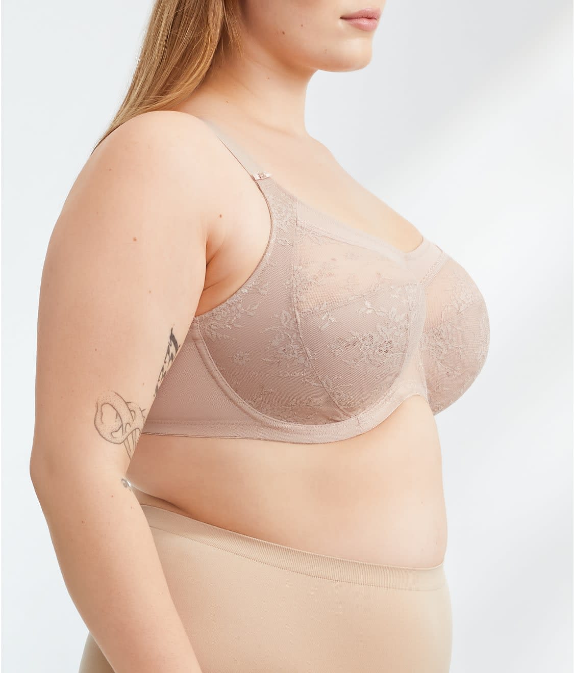 • Pretty floral lace overlay on cups with sheer mesh trim