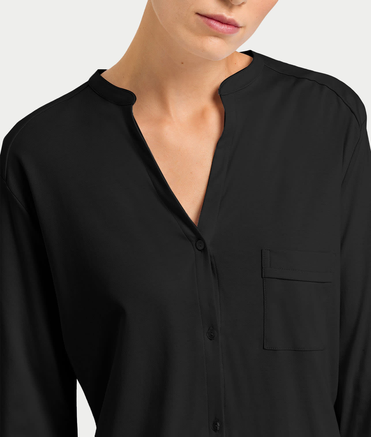 - Button-down top with mandarin collar and patch pocket