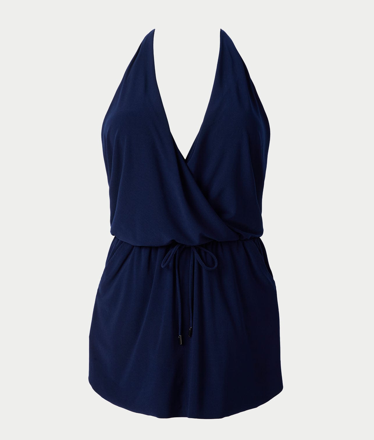 • Plunging V-neckline with self-tie halter stretch straps