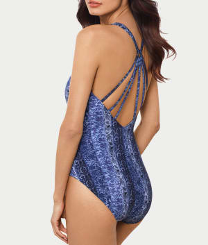 - Flaunt your stylish side in this printed one-piece with blue hues