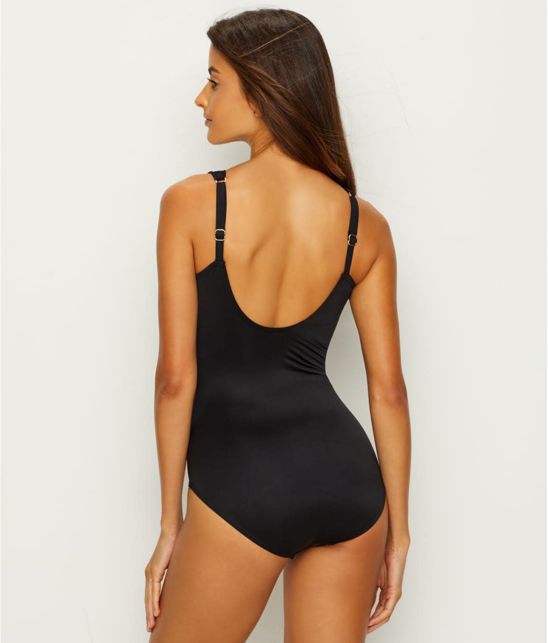 • Cross-over shirred detail elongates torso