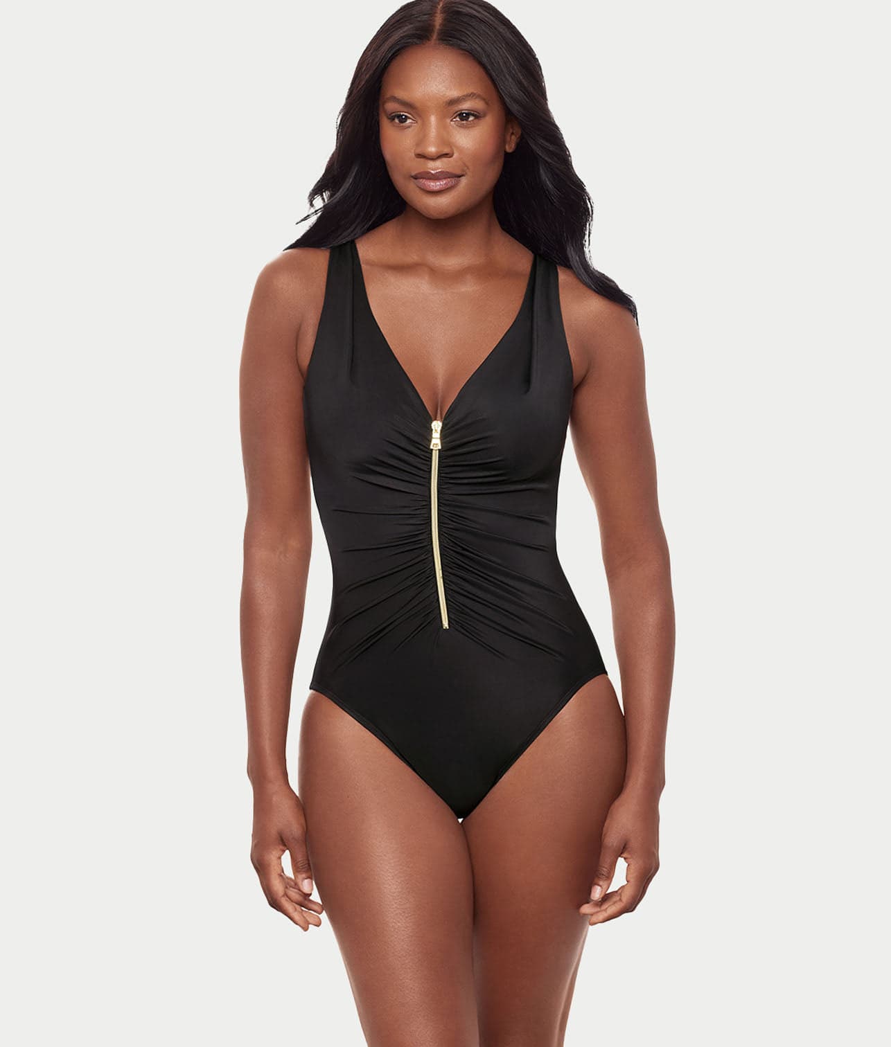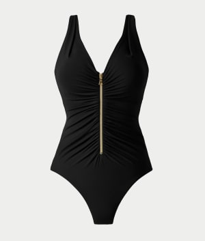 - Plunging one-piece with a functioning zip-front