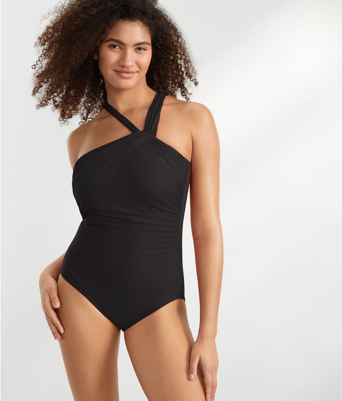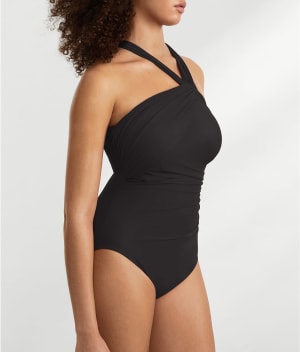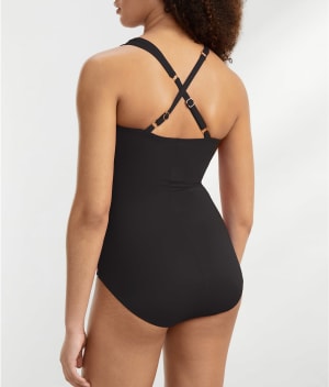 • Cross-over shirring elongates torso for a sleek silhouette