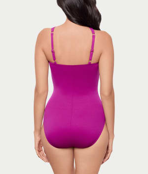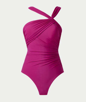 • Cross-over shirring elongates torso for a sleek silhouette