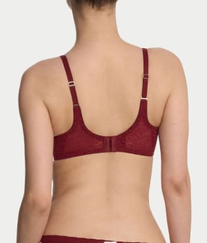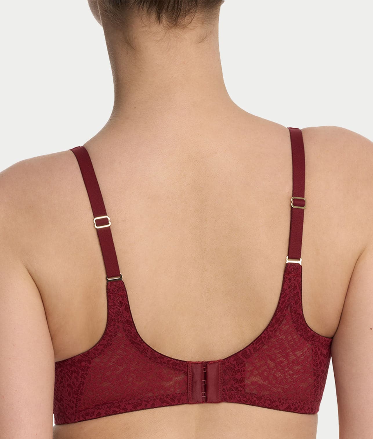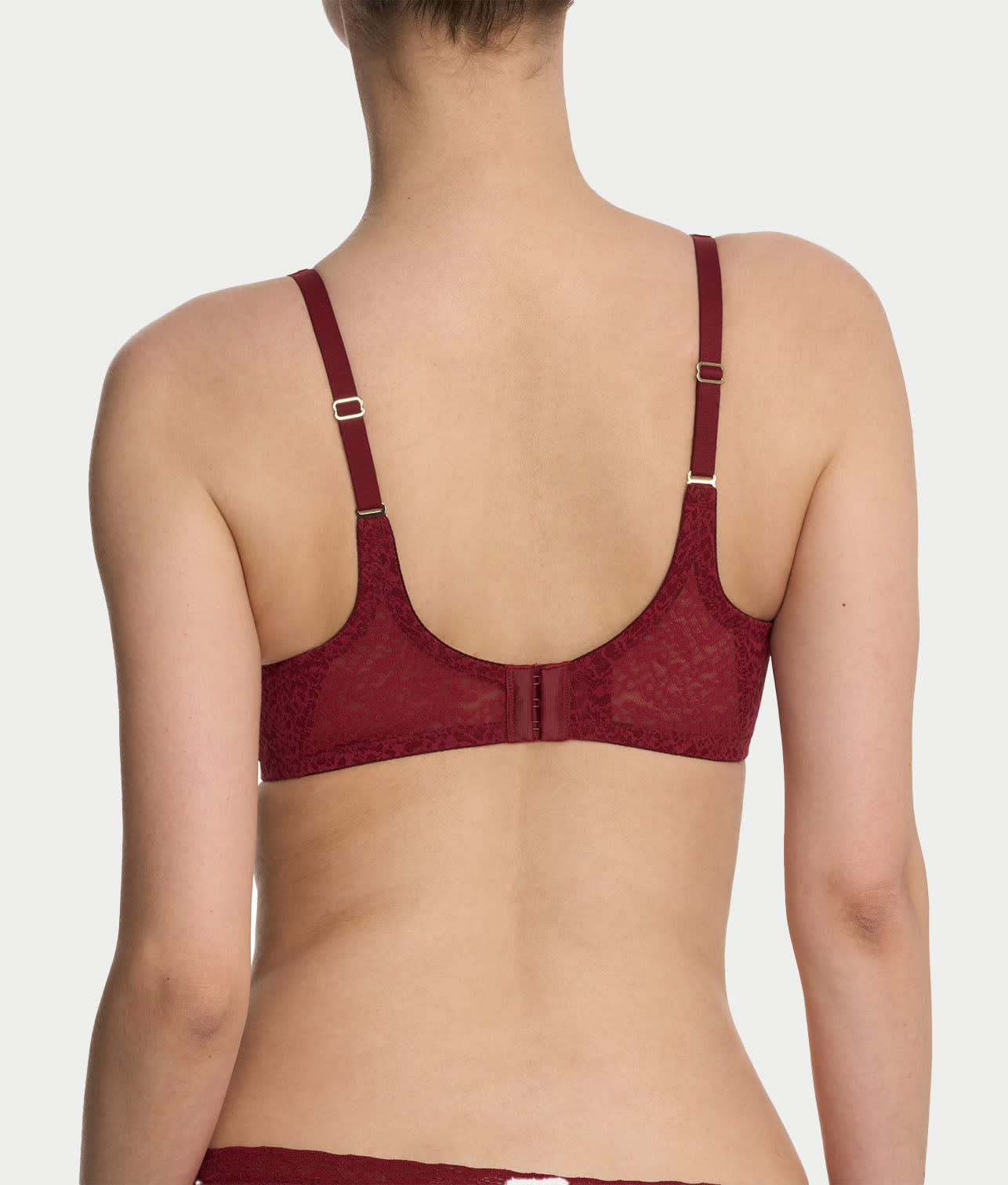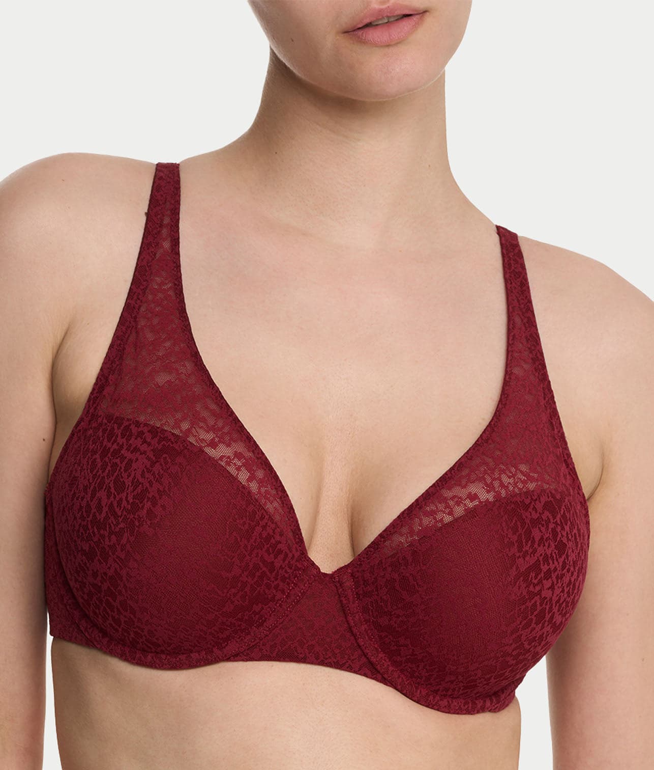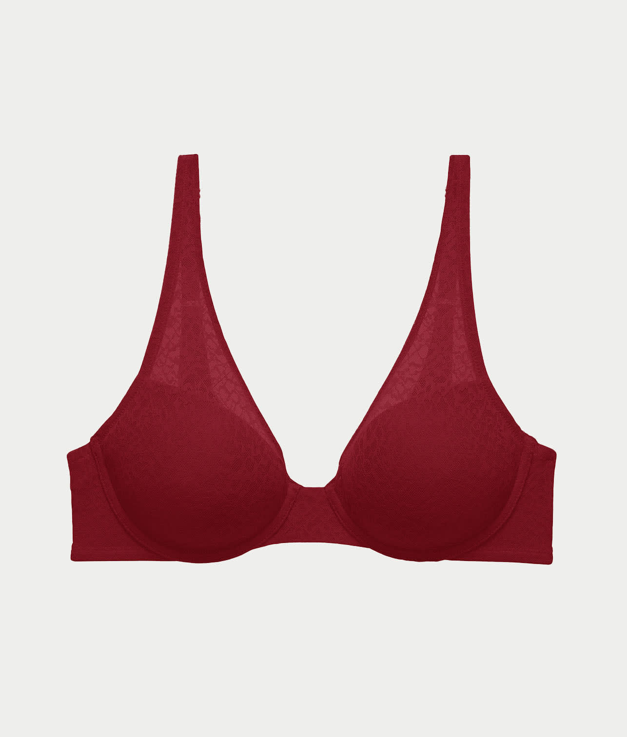 - Sheer stretch lace overlay atop foam-lined underwire cups