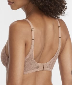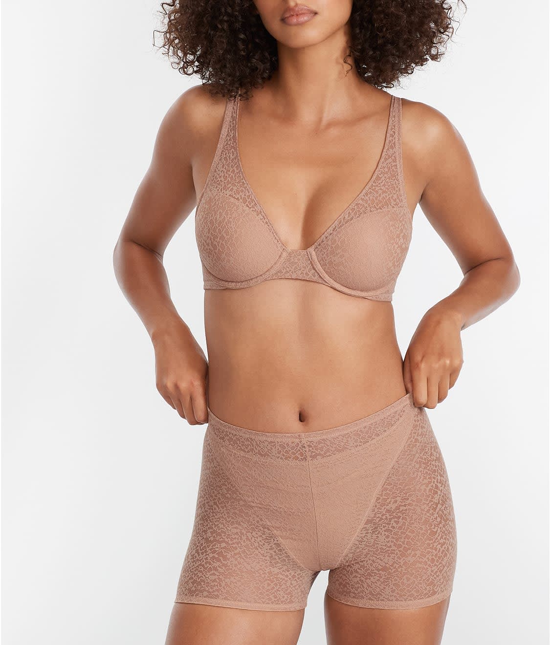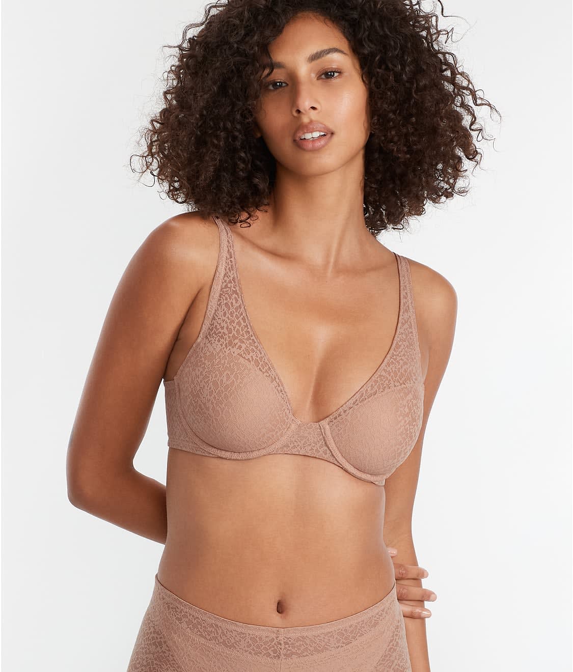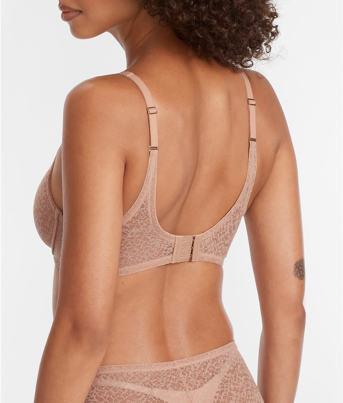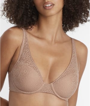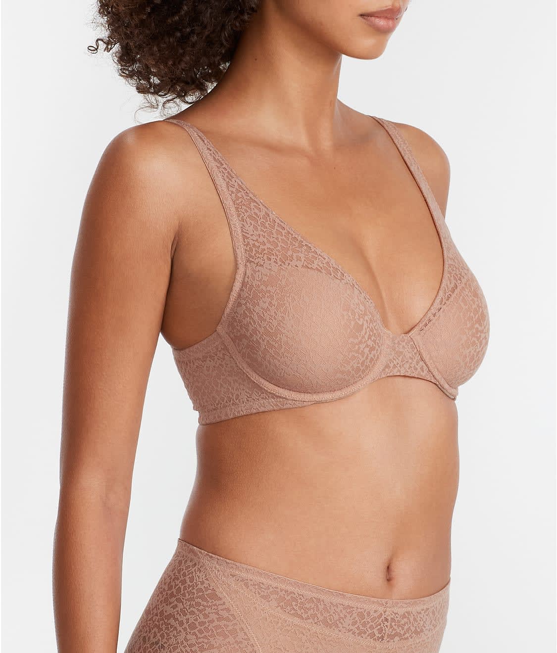 • Sheer stretch lace overlay atop foam-lined underwire cups