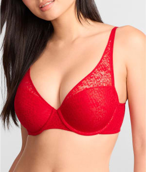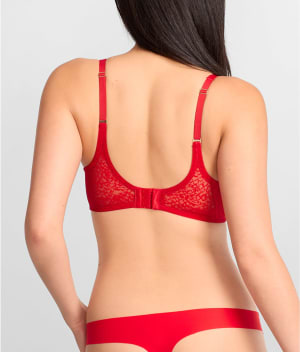 - Sheer stretch lace overlay atop foam-lined underwire cups