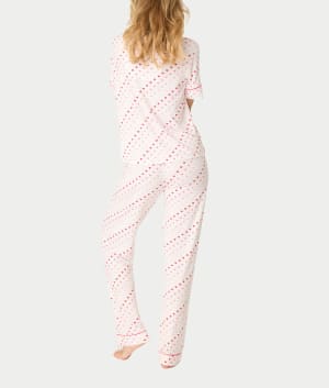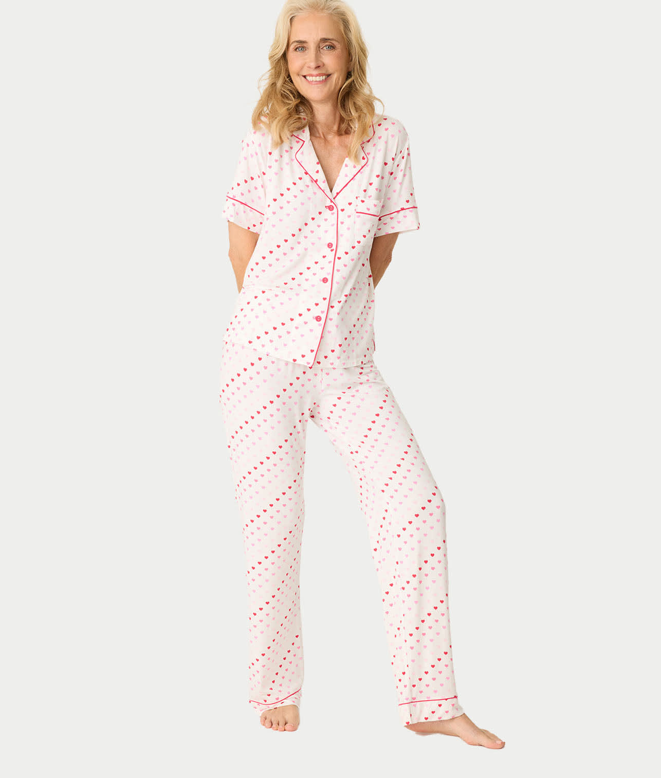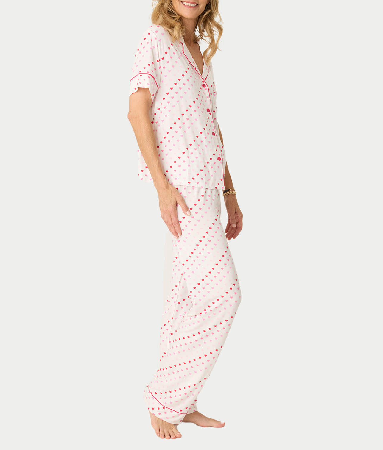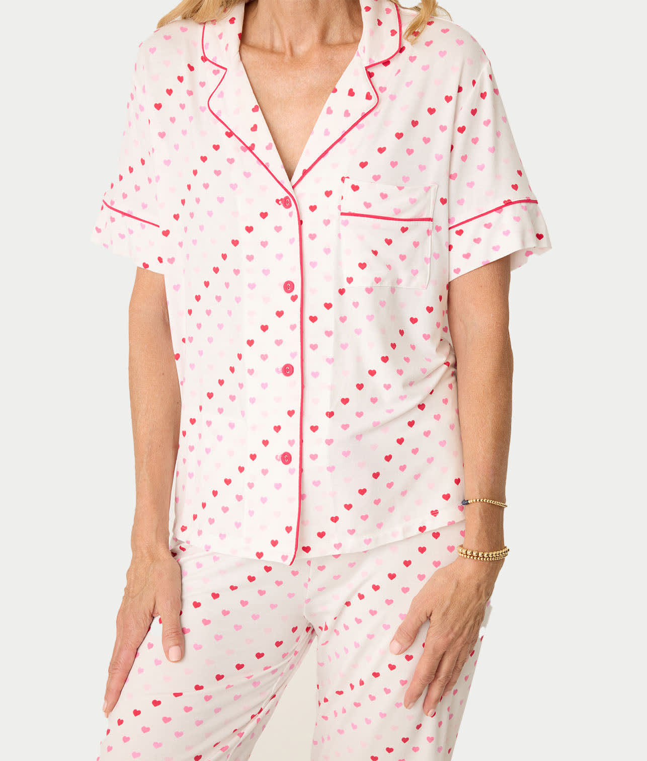 • Button-down v-neckline with contrasting red piping & short sleeves