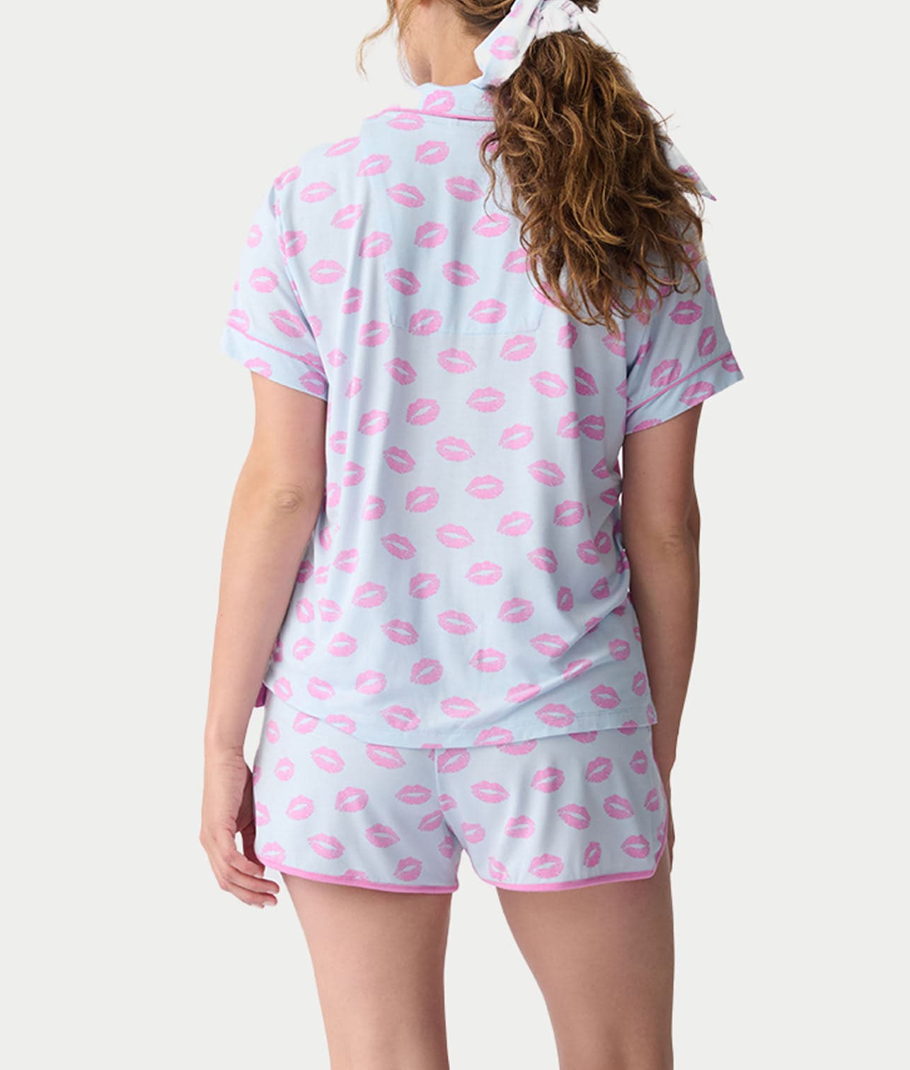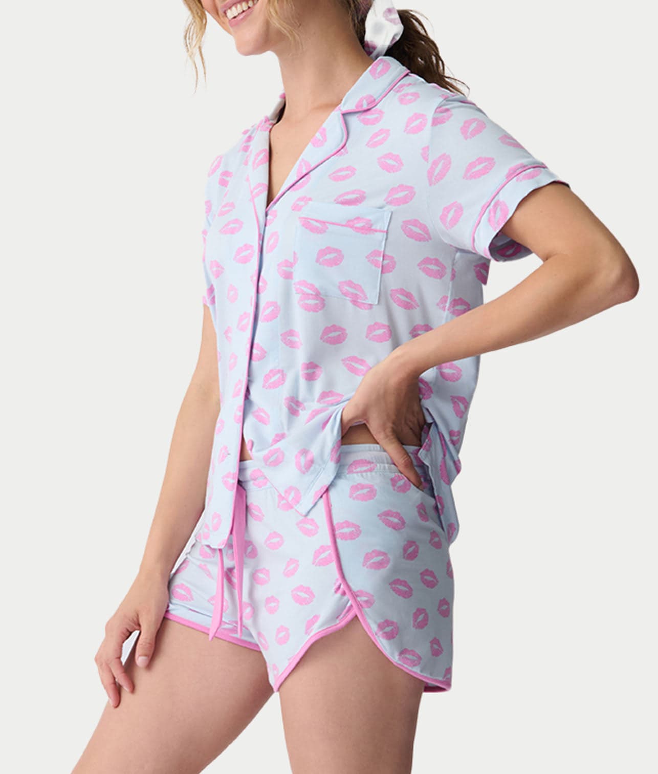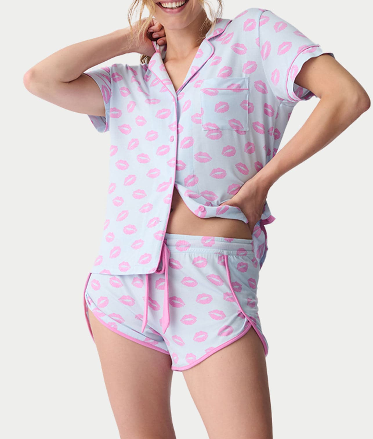 - Pucker up in this adorable blue and pink pajama set