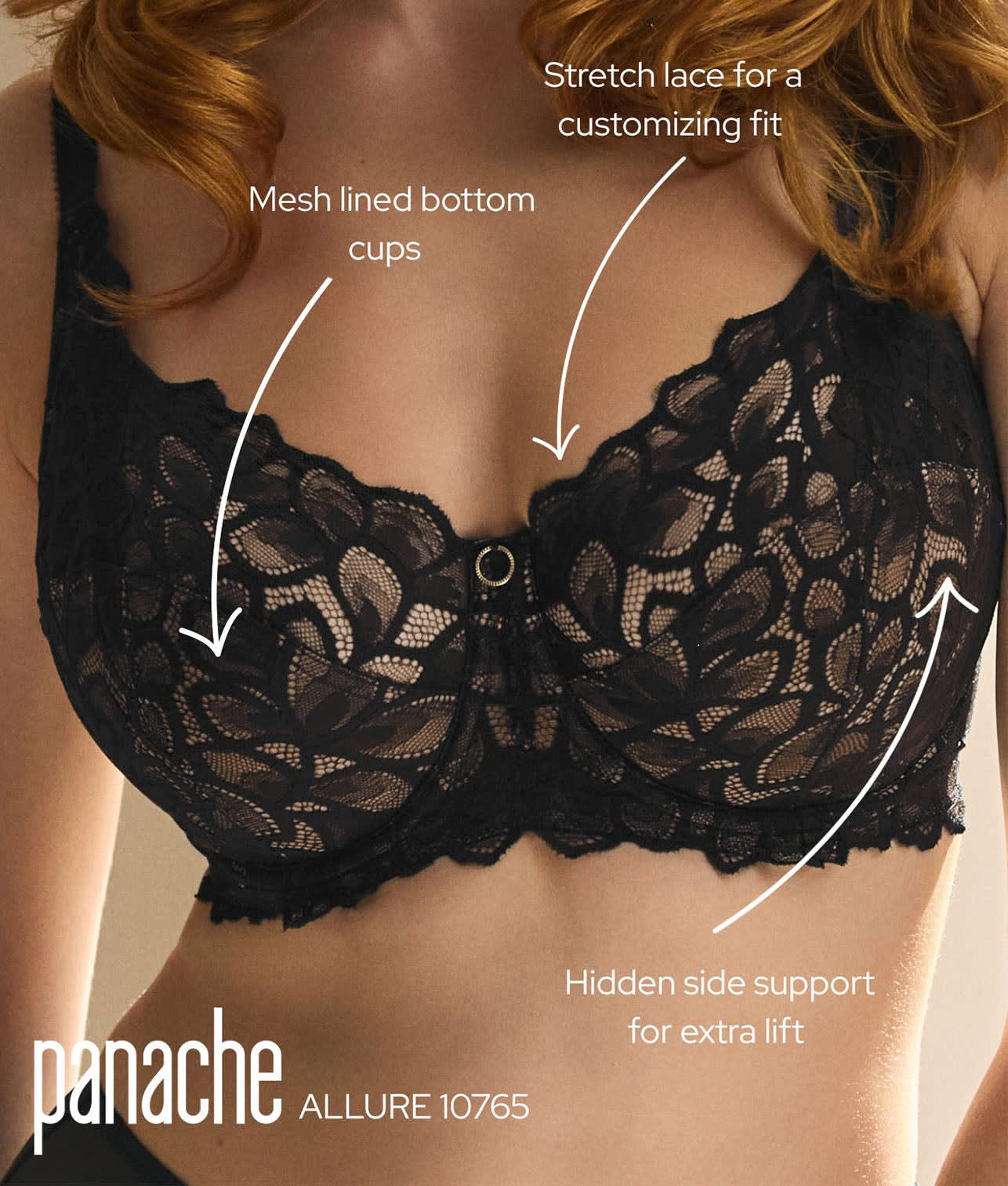 - Semi-sheer top cups with seamed mesh lining at lower cups