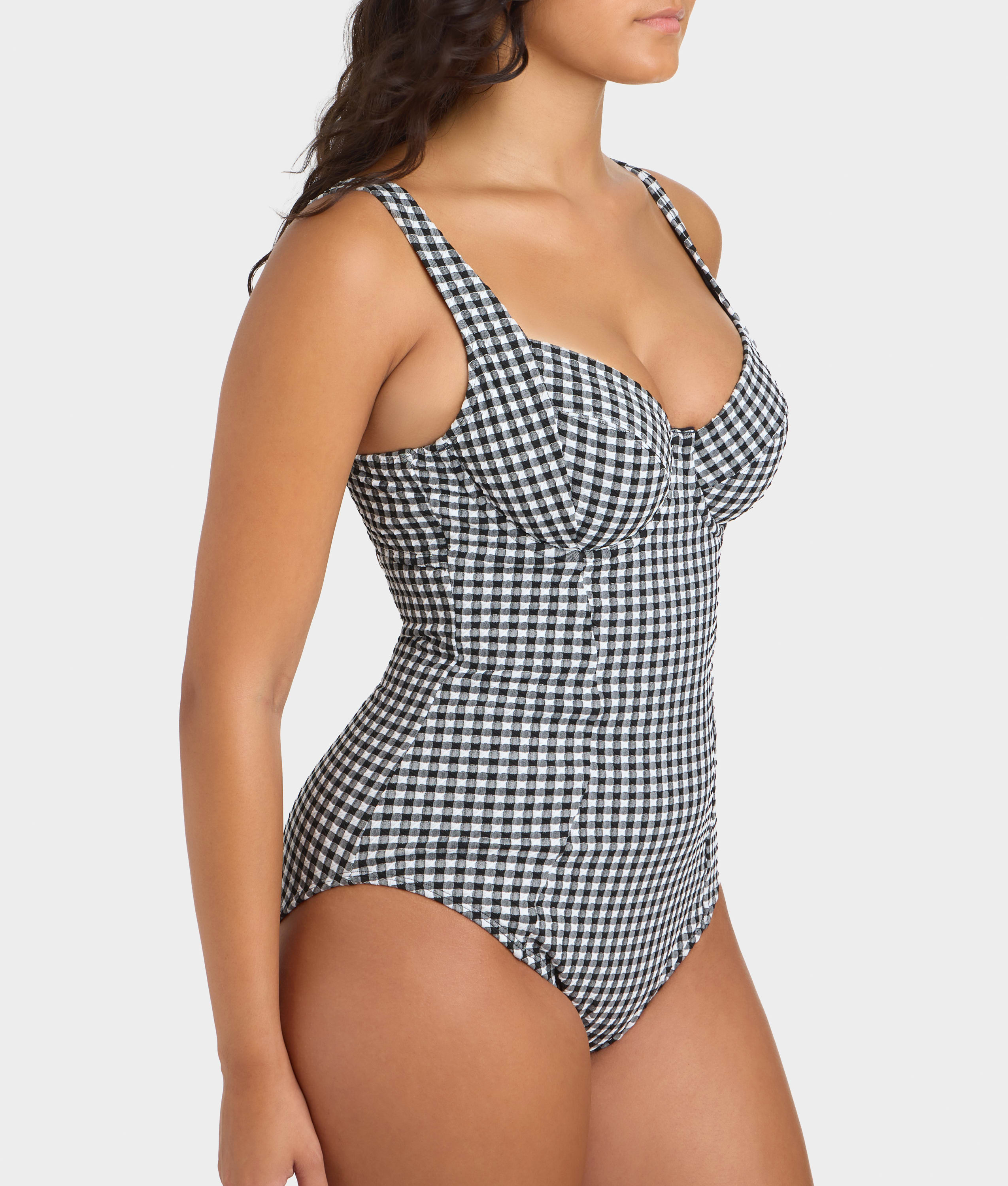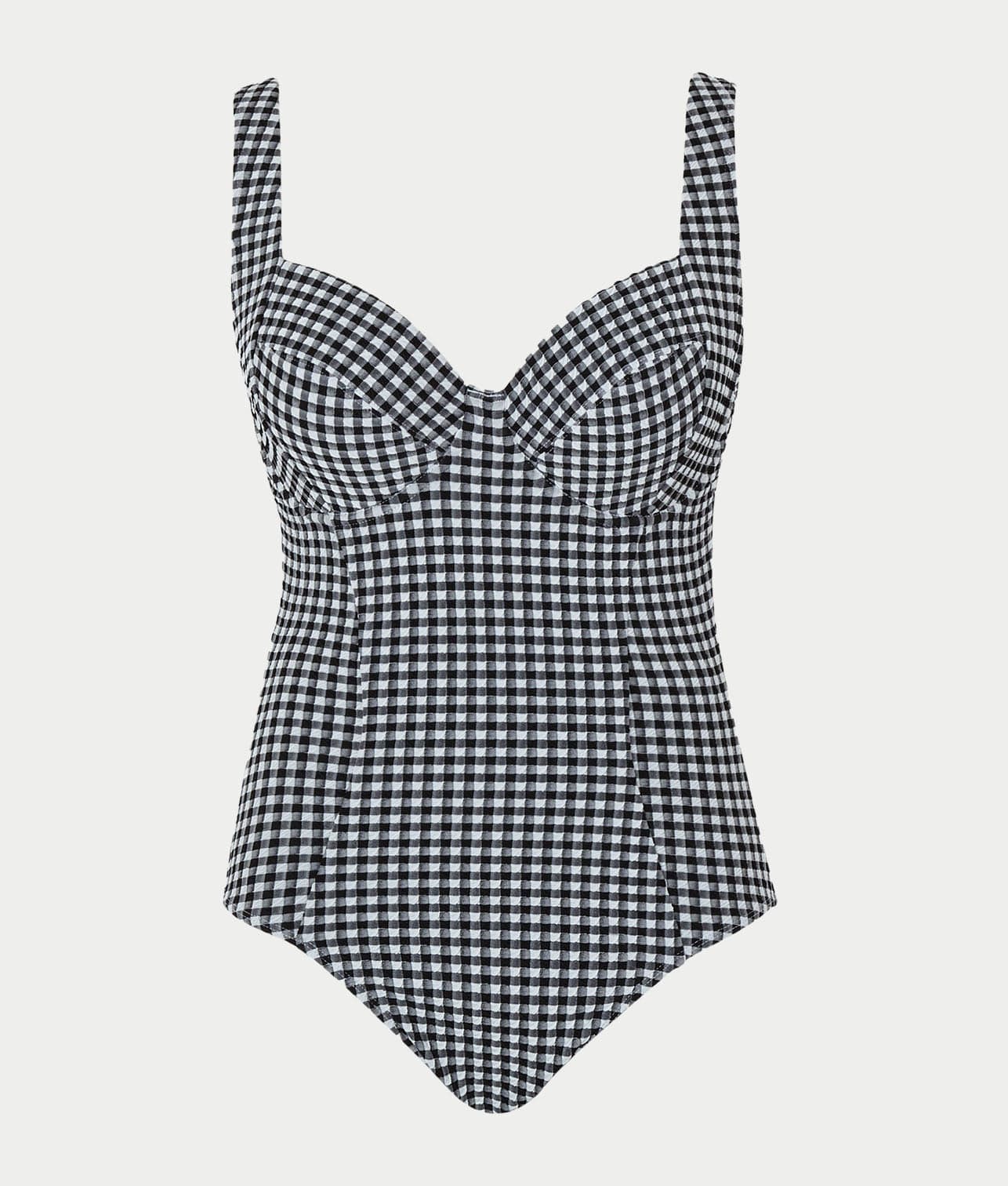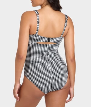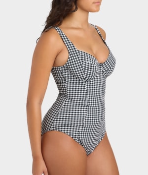 - Feel confident with a smooth fit in this gingham one-piece
