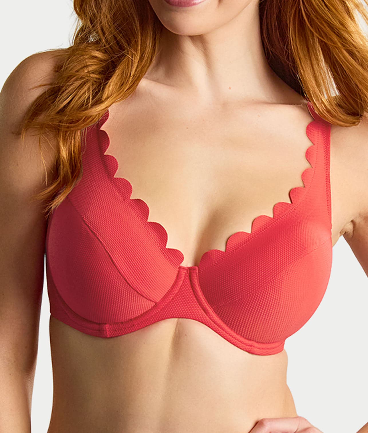 - Flirty plunging bikini top with scalloped trim