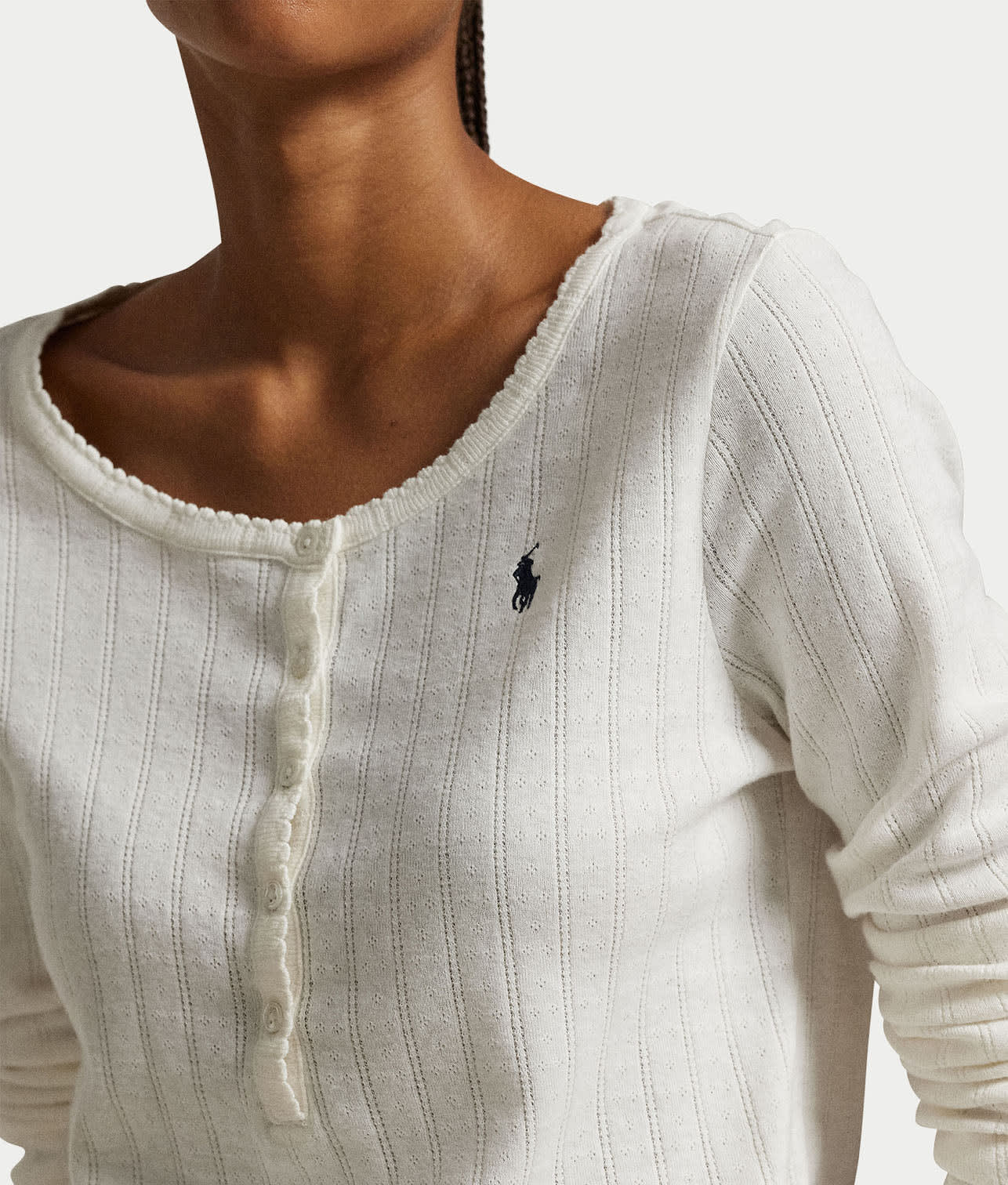 • Long sleeve top with classic henley button placket that offers adjustable coverage