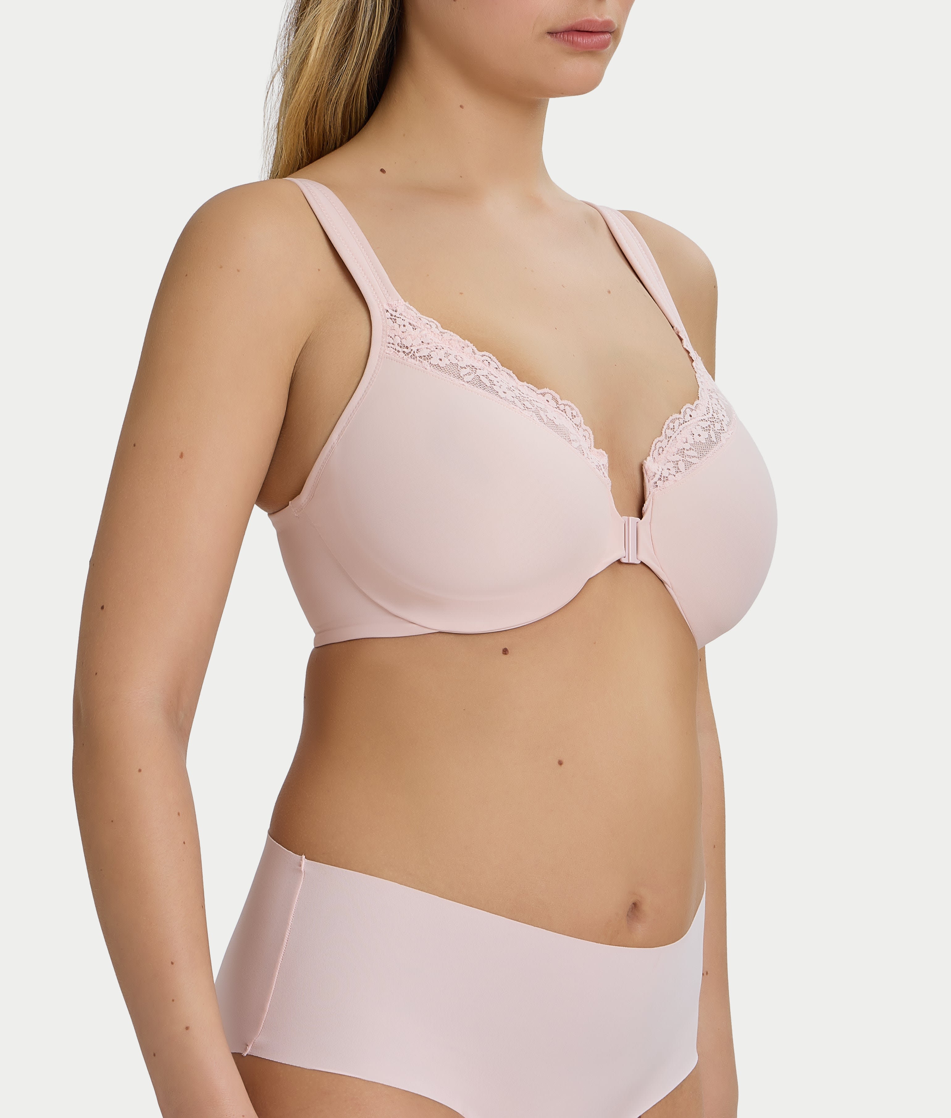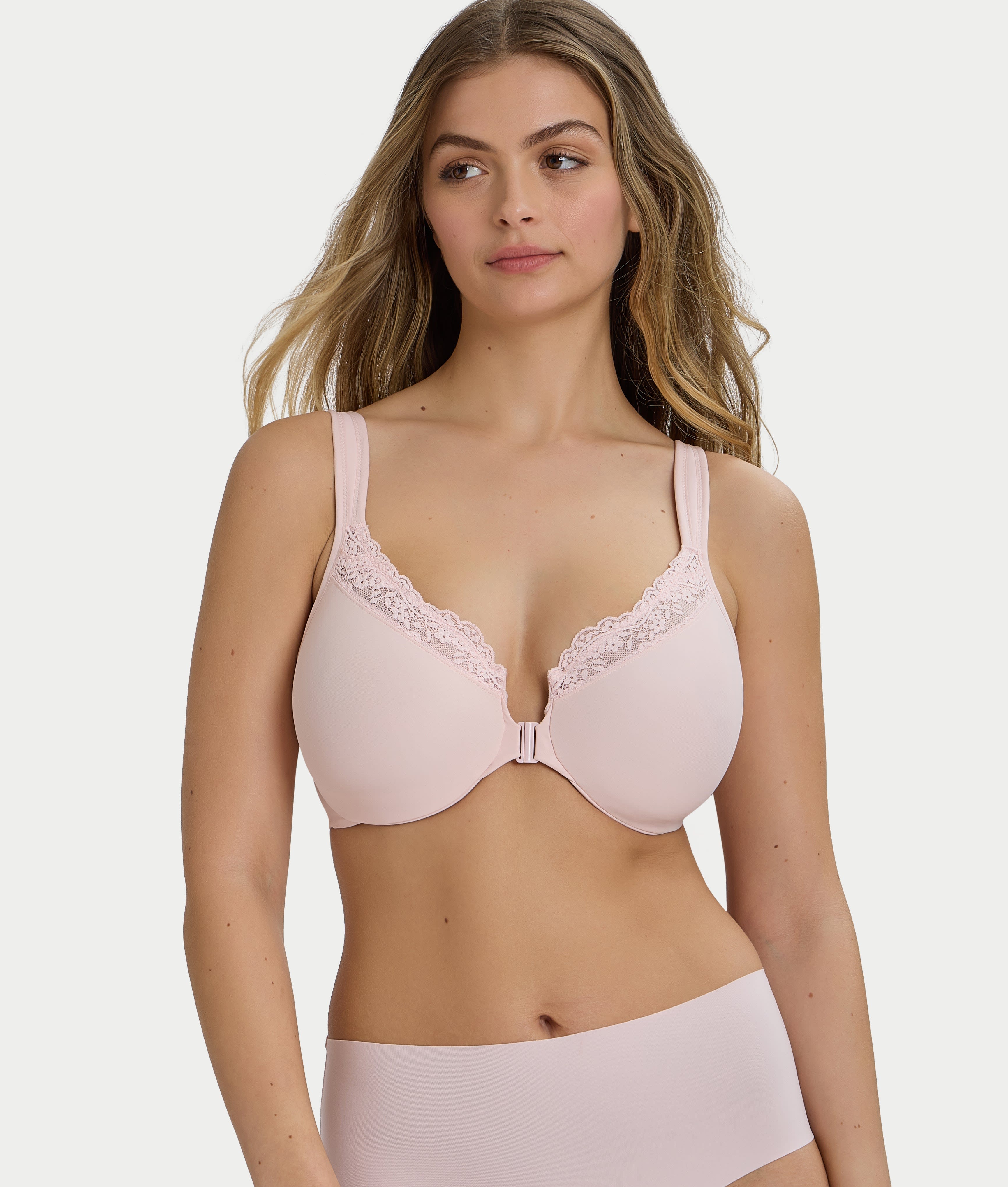 Seem up to an inch smaller in our minimizer that’s designed to be effortless in every way, from the front-closure and cushioned adjustable straps to the smooth, seamless stretch microfiber that does all the minimizing magic.