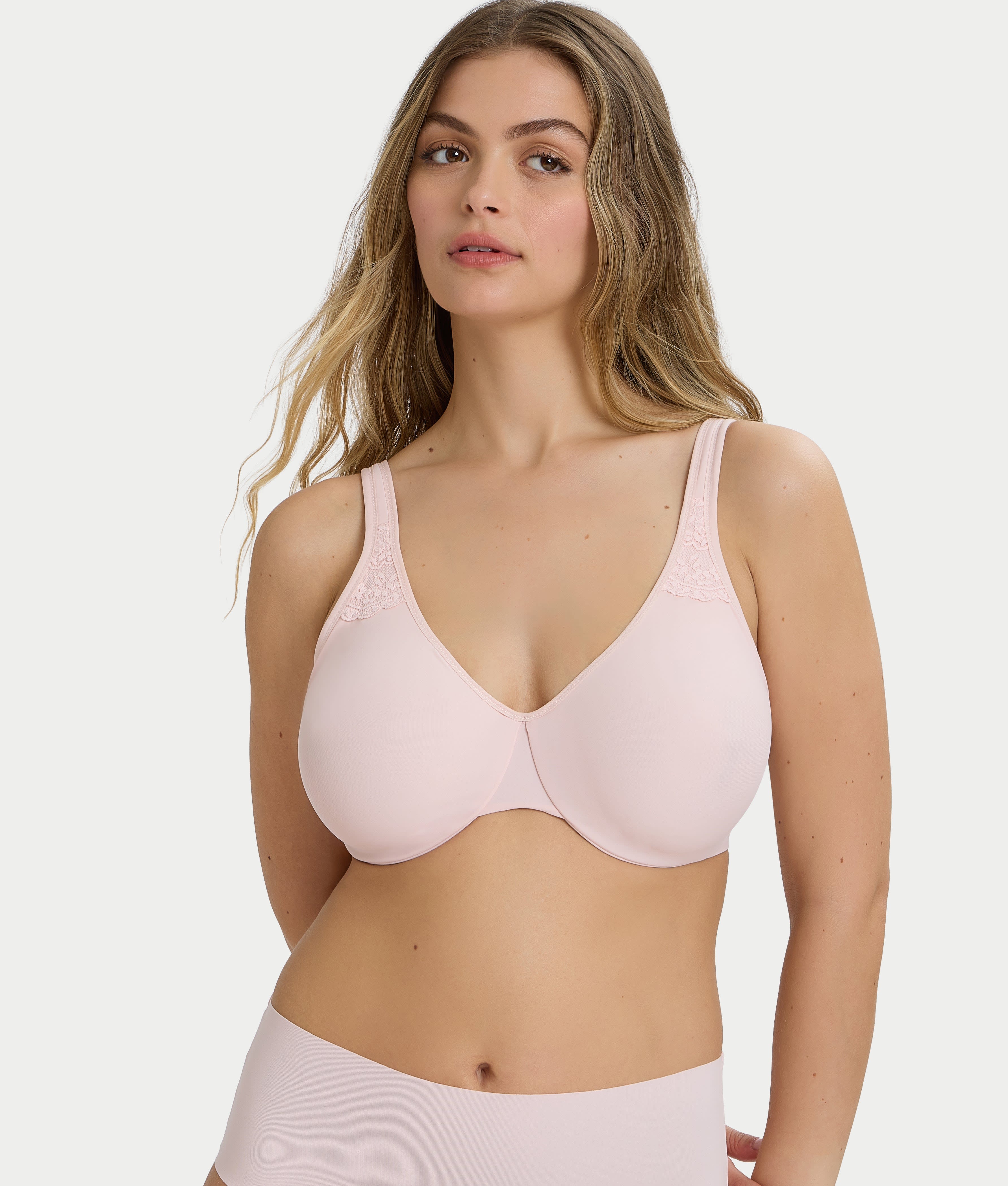 Our idea of sweet and simple: stretch microfiber cups, plus a pretty hint of lace, that minimize up to an inch. The dual-layer cups redistribute your chest in comfort and a welcome hint of feminine style.
