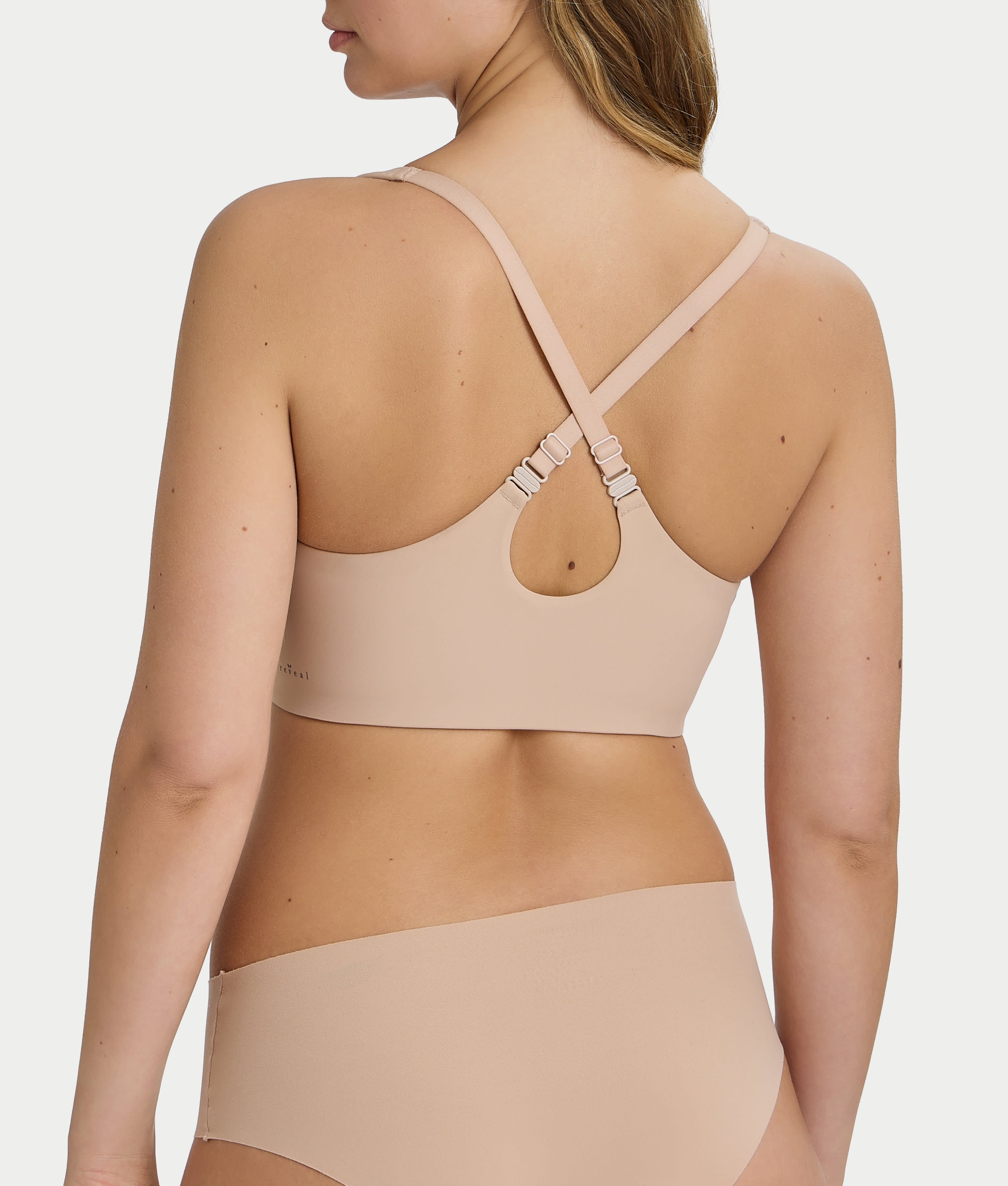 - Back adjustable stretch straps convert to criss-cross