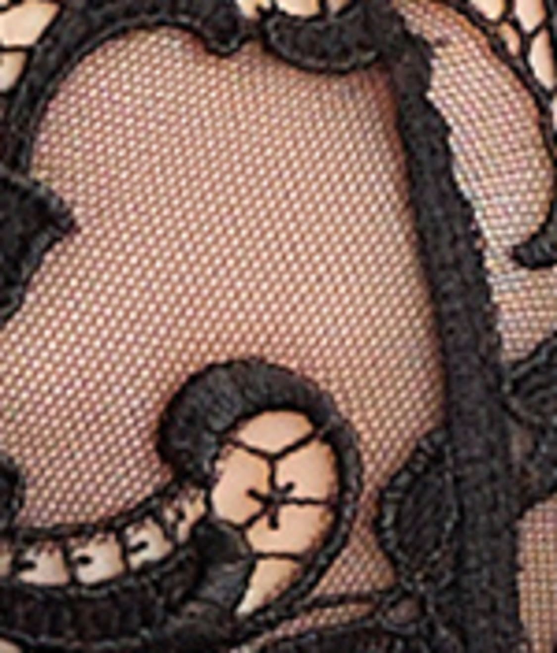 • Floral lace embroidery atop contrasting sheer tulle