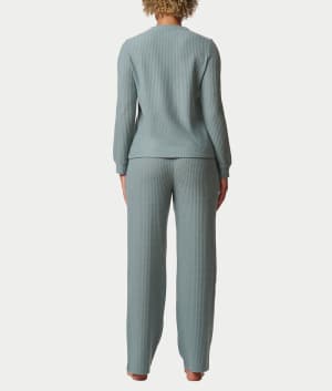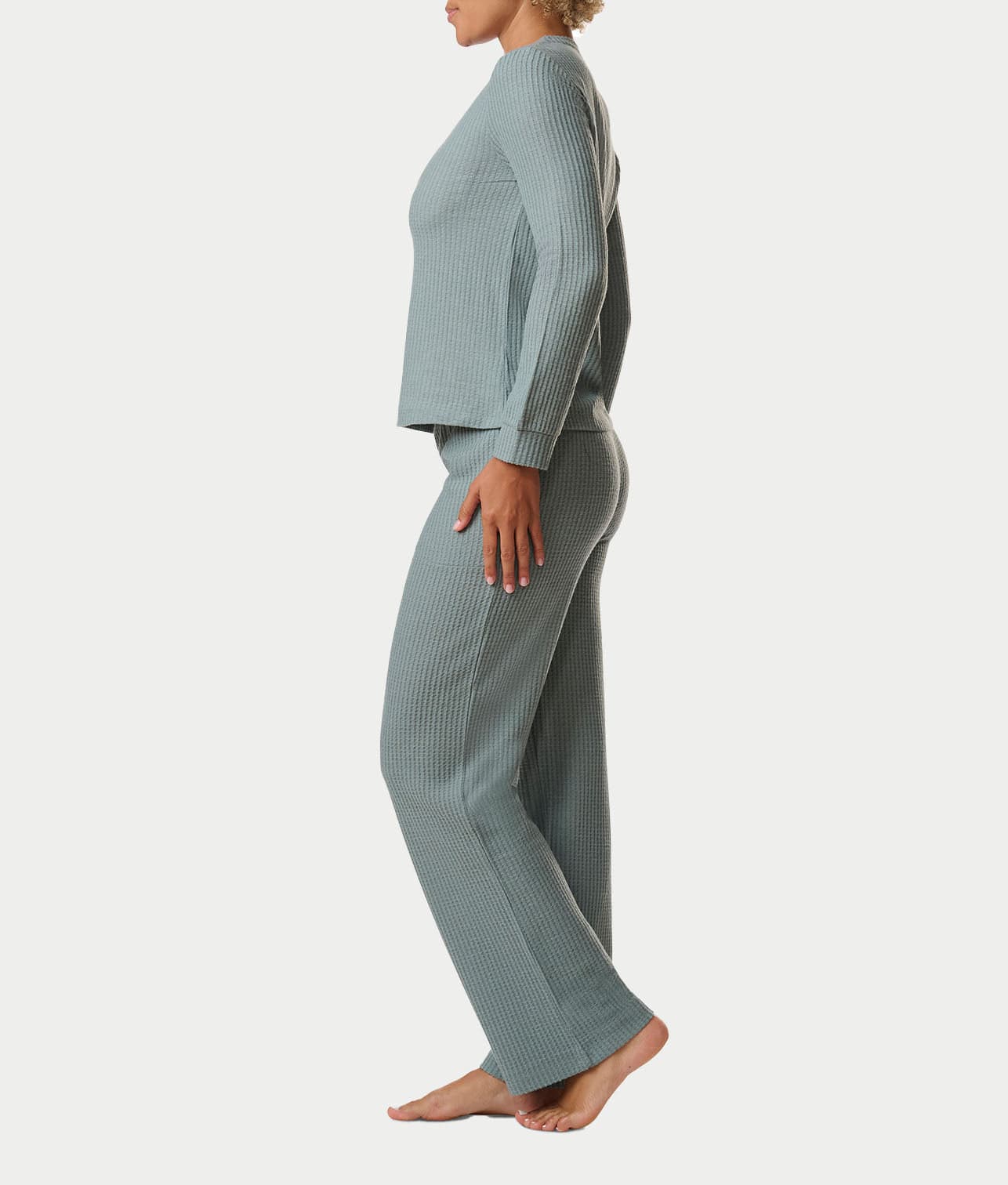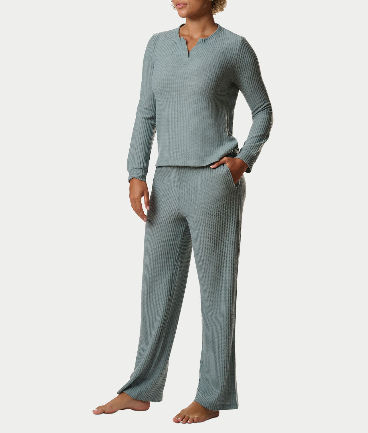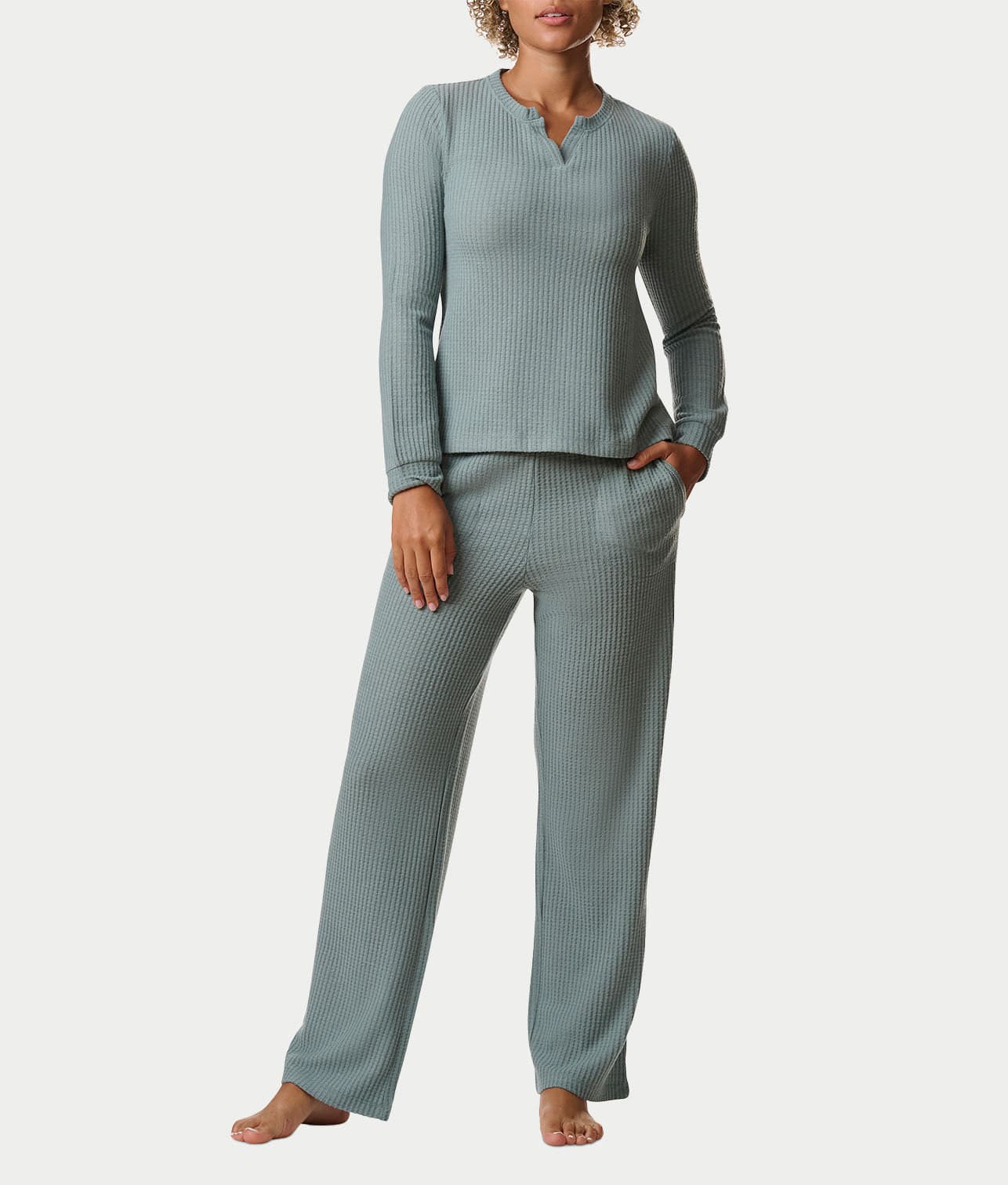 • No-dig elastic waistband on wide leg relaxed fit pants