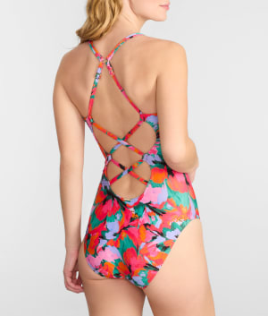 - Lay on the sand in this sleek printed V-neck one-piece