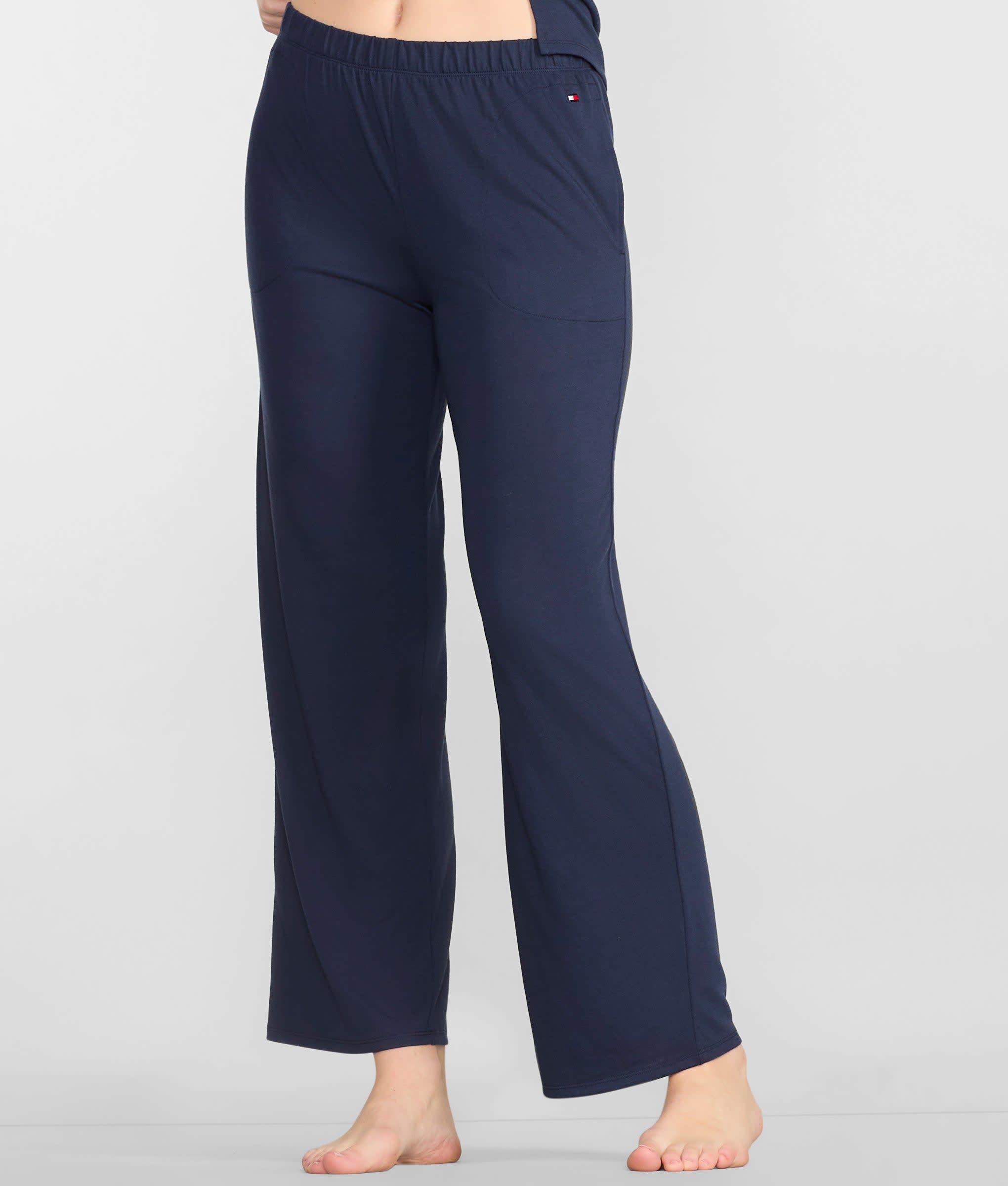 • Elastic waistband on wide leg pants; no pockets